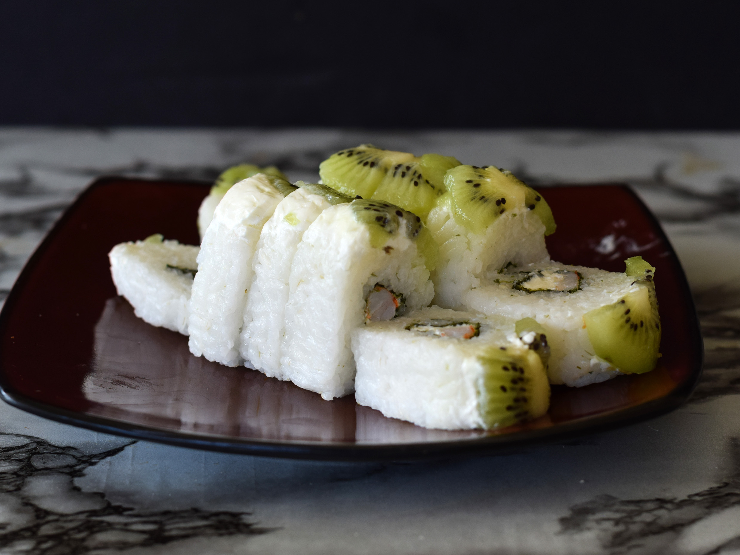 Relleno Philadelphia y camarón empanizado Forrado de kiwi Bañado de calagua