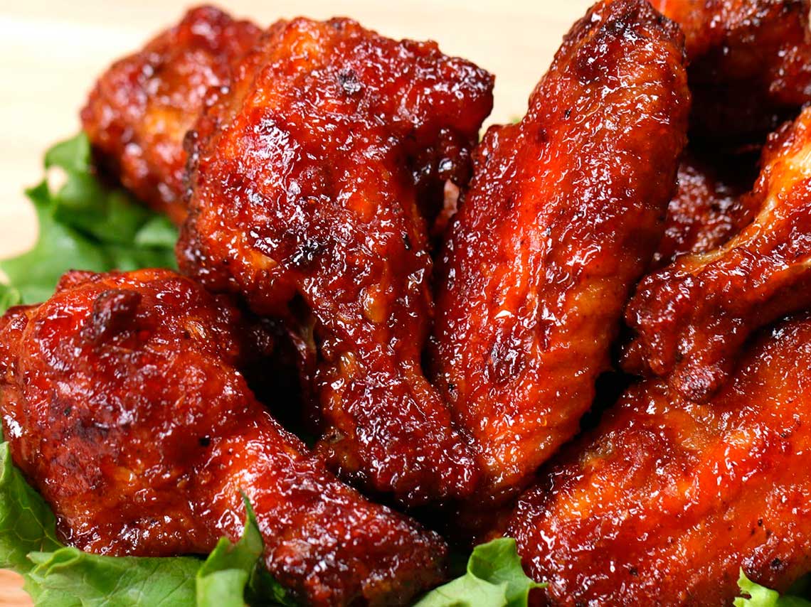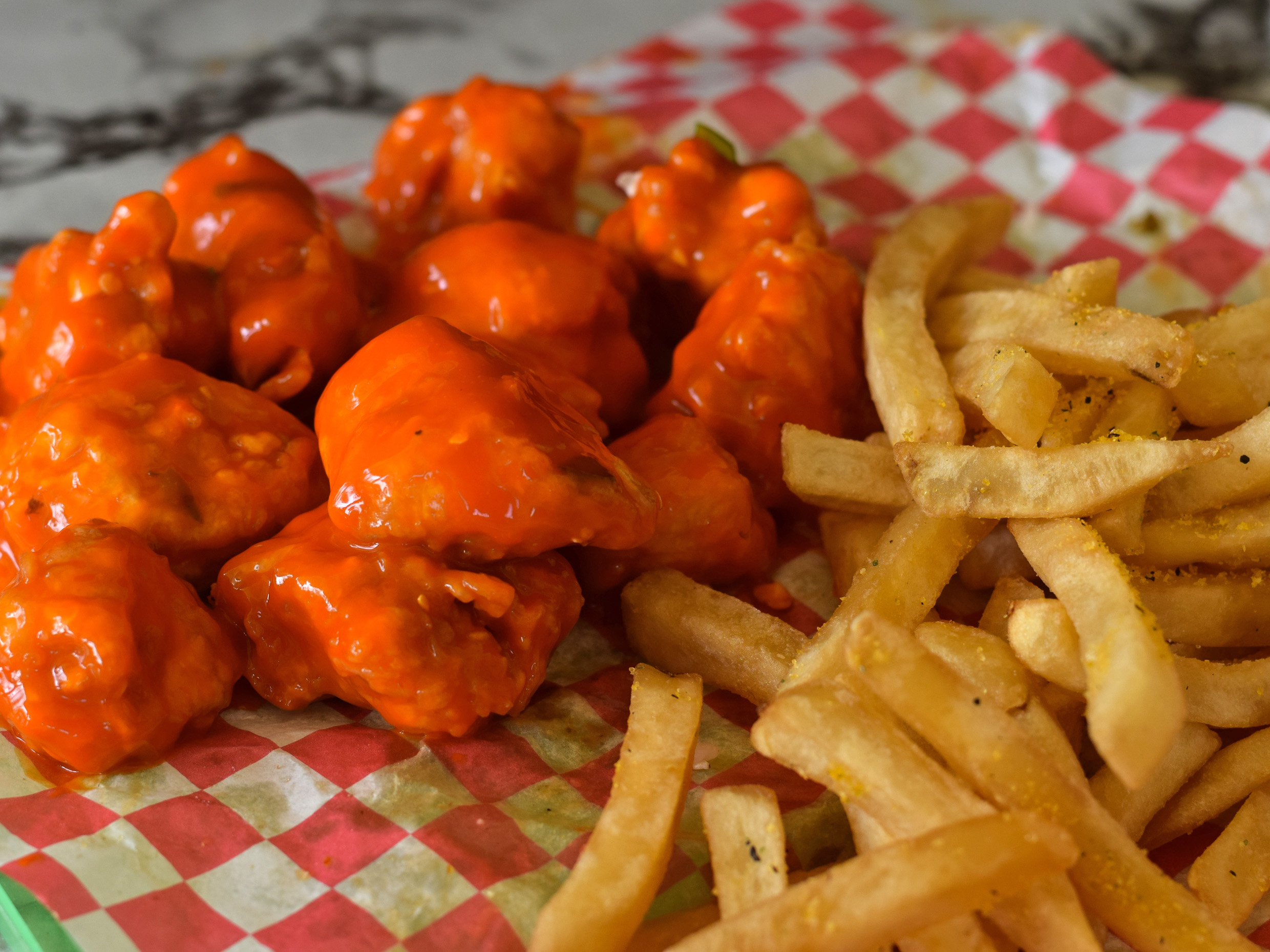Alitas bañadas en tu salsa favorita acompañadas de papas a la francesa