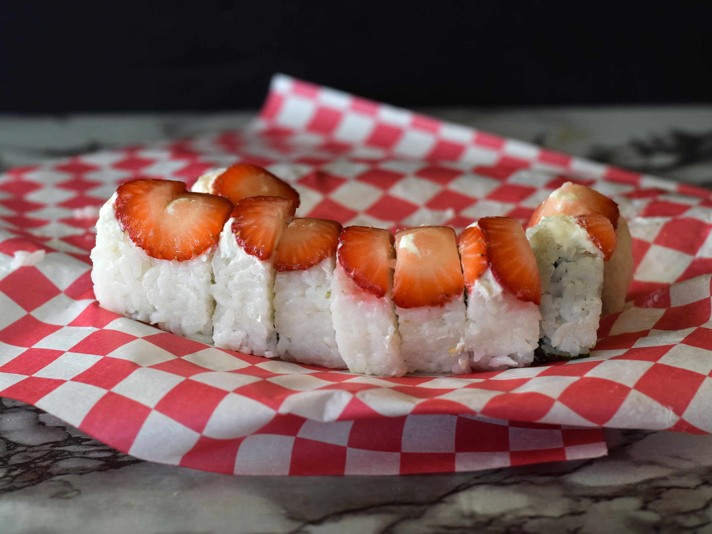Relleno de camarón empanizado, y Philadelphia forrado de fresa bañado de calagua