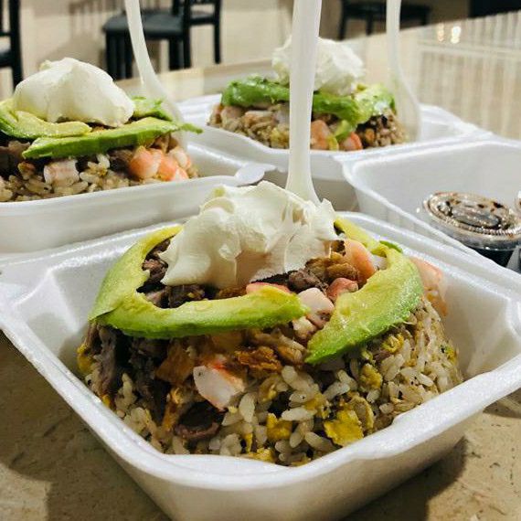 Arroz, zanahoria, calabaza, cebollín, soya, sal de ajo, pimienta, huevo Coronado de Filadelfia y aguacate y camaron.
