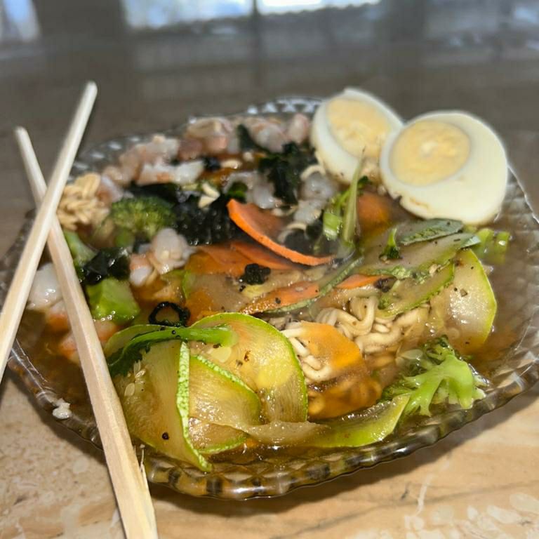 Calabaza,brócoli, zanahoria. Huevo srirscha salsa soya,sal de ajo wakamen