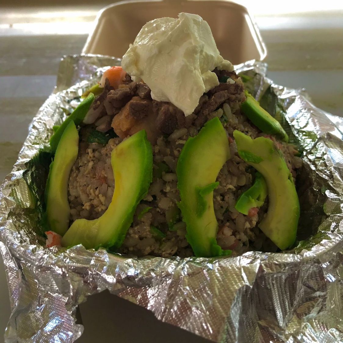 Arroz, zanahoria, calabaza, soya, sal de ajo, pimienta, huevo Coronado de aguacate Filadelfia.