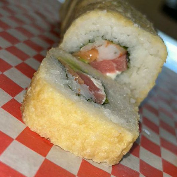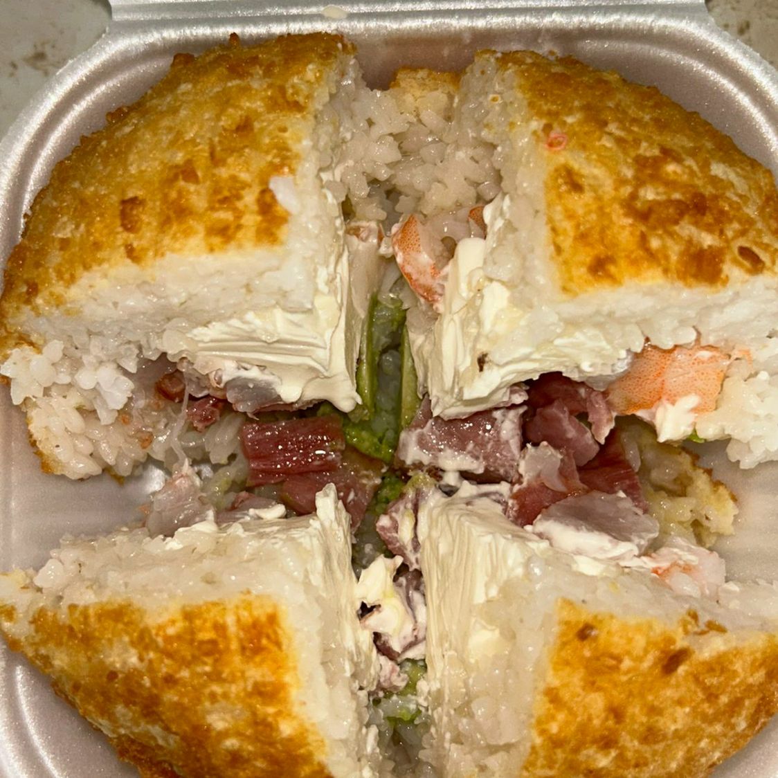 Sushi Ball rellena de Philadelphia, aguacate, camarón, surimi, kanikama, forrada de chetos Flaming hot