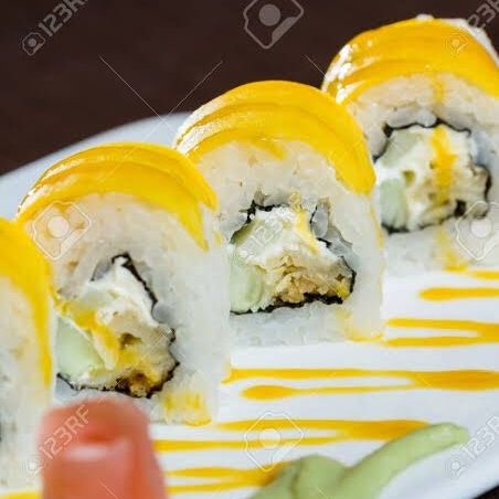 Relleno de Philadelphia, camaron empanizado,Forrado de mango,bañado de calagua