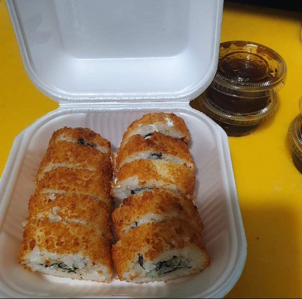 Panko Roll (10 bocados, porción personal), delicioso rollo relleno de aguacate, camarón, surimi y queso philadelphia, bañado con salsa de anguila y salsa de soya, chiles toreados, incluye palillos hashi.