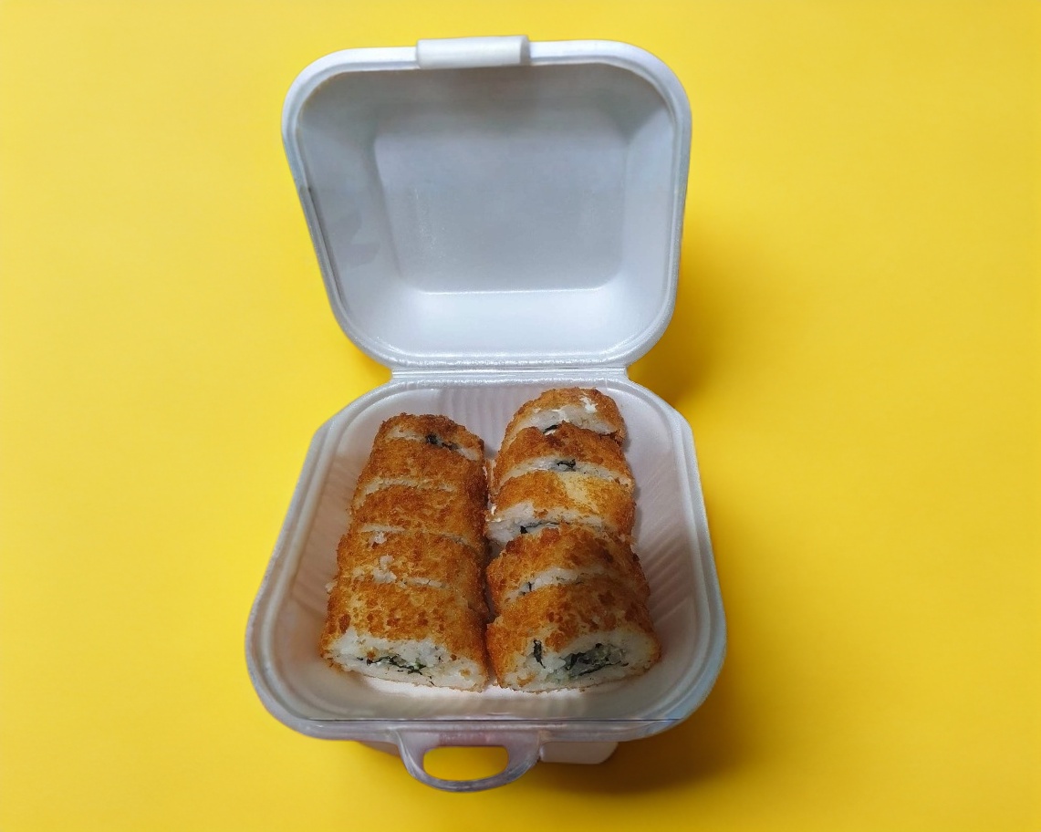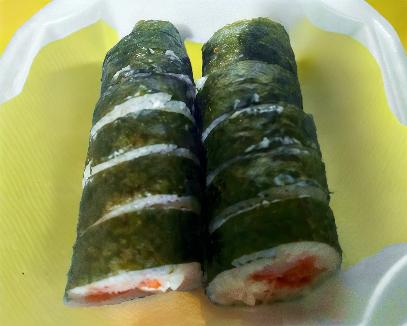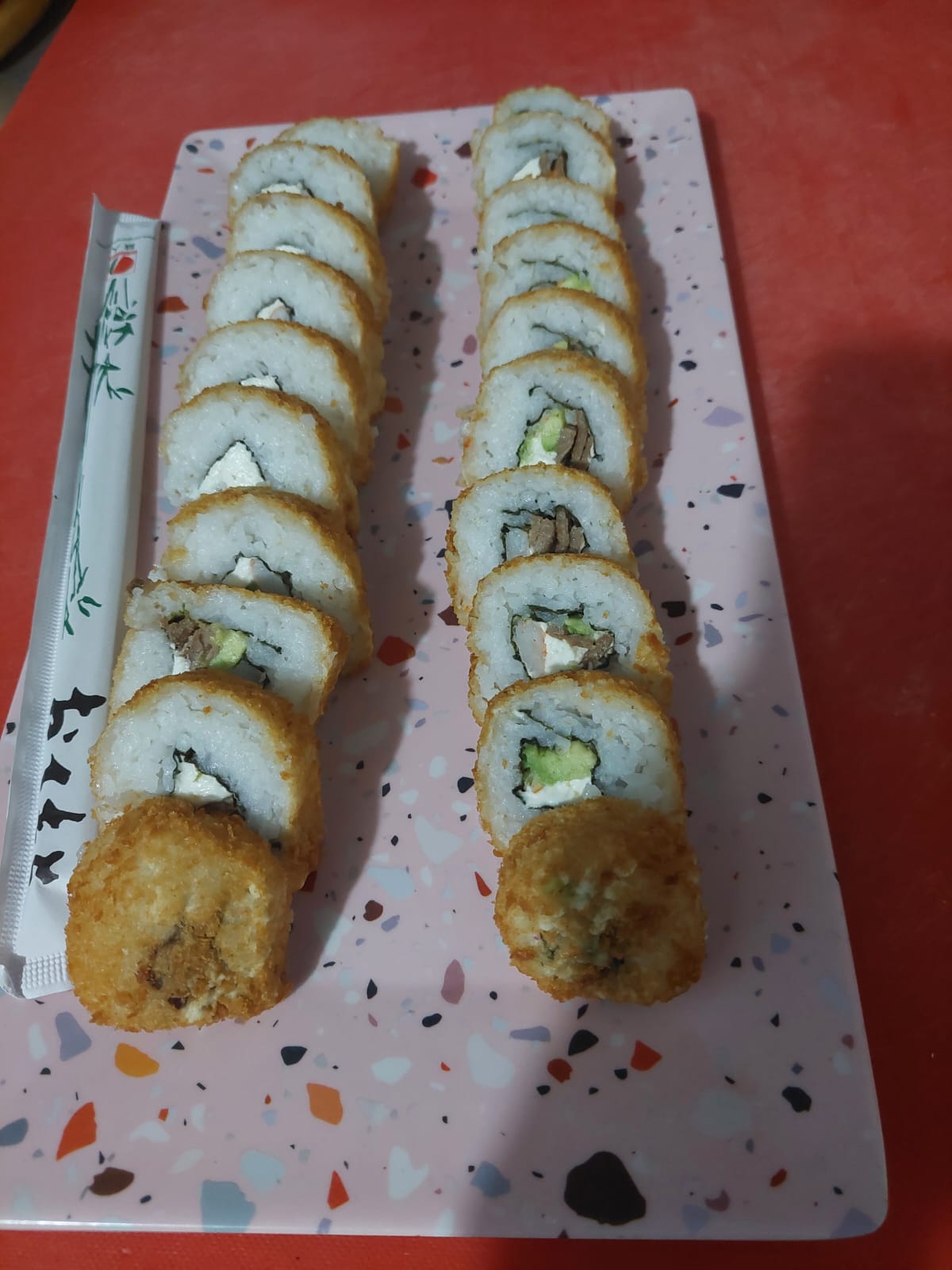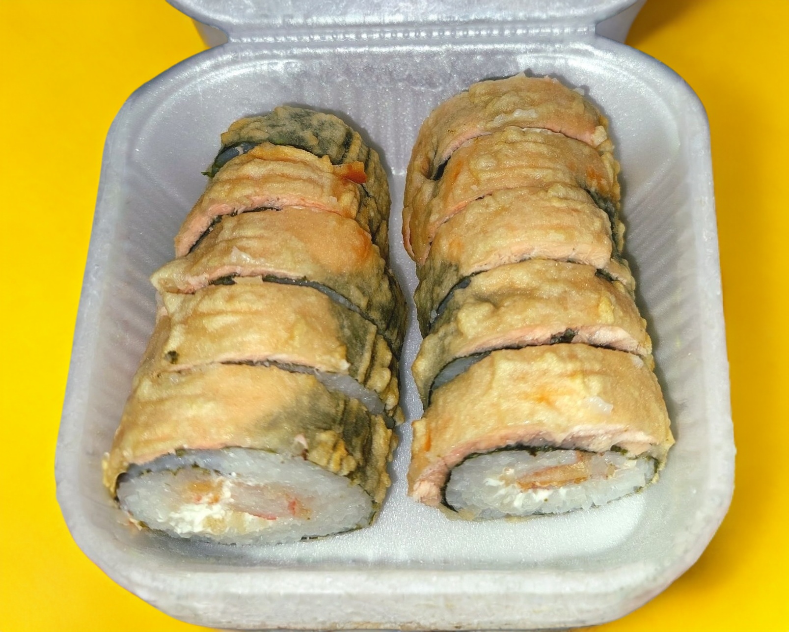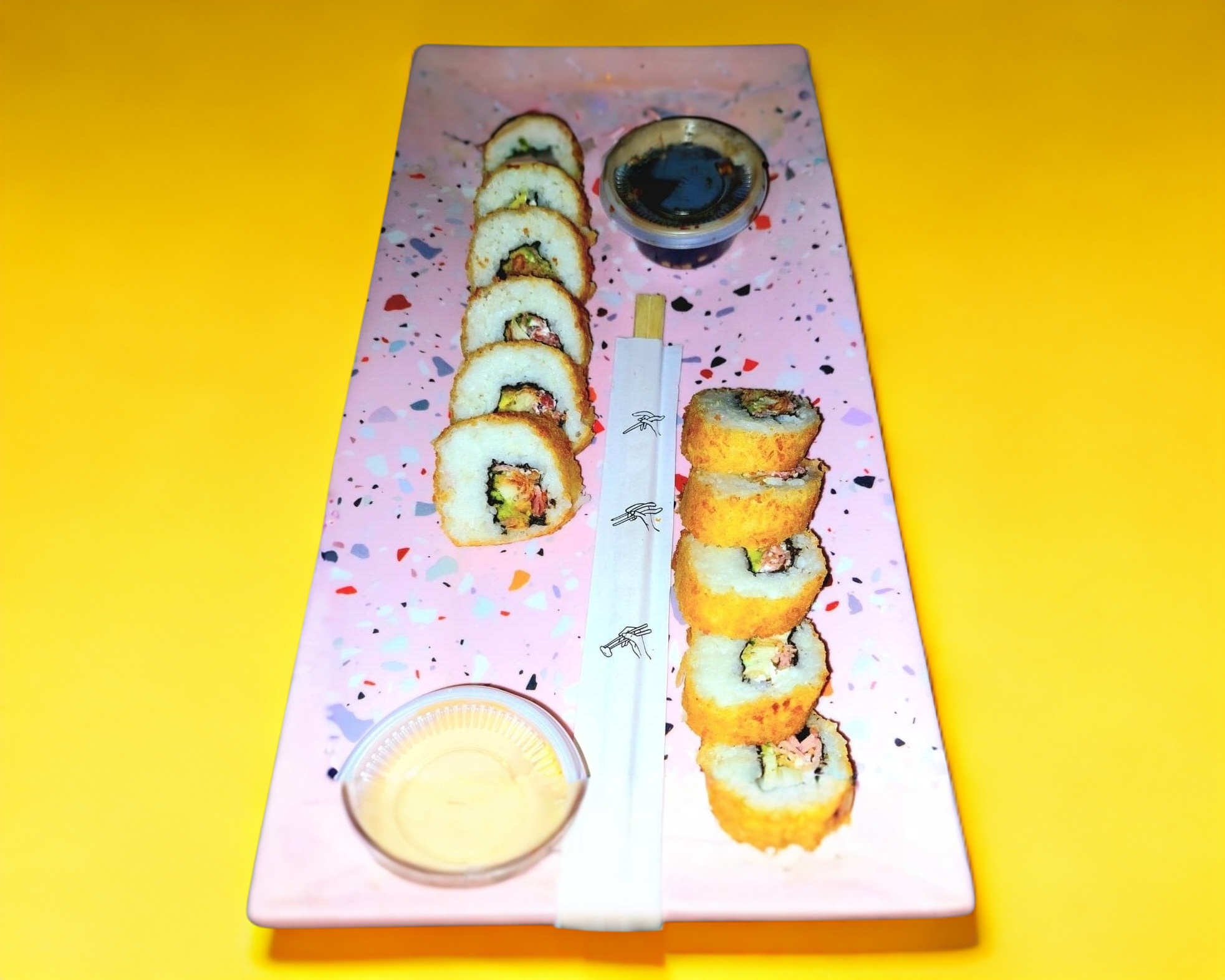 Aguacate, camarón y kanikama frito, philadelphia, sriracha y cubierto en alga nori.