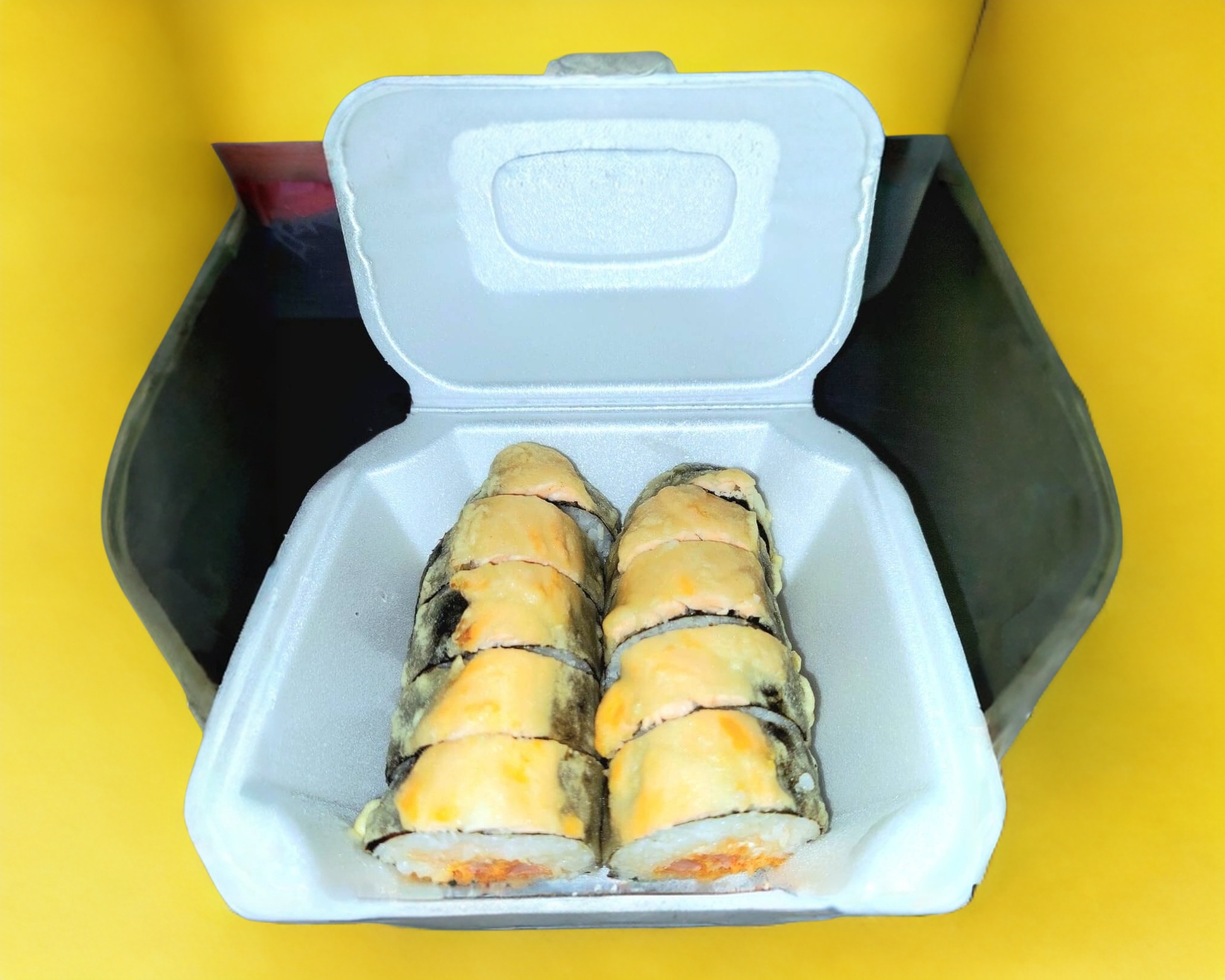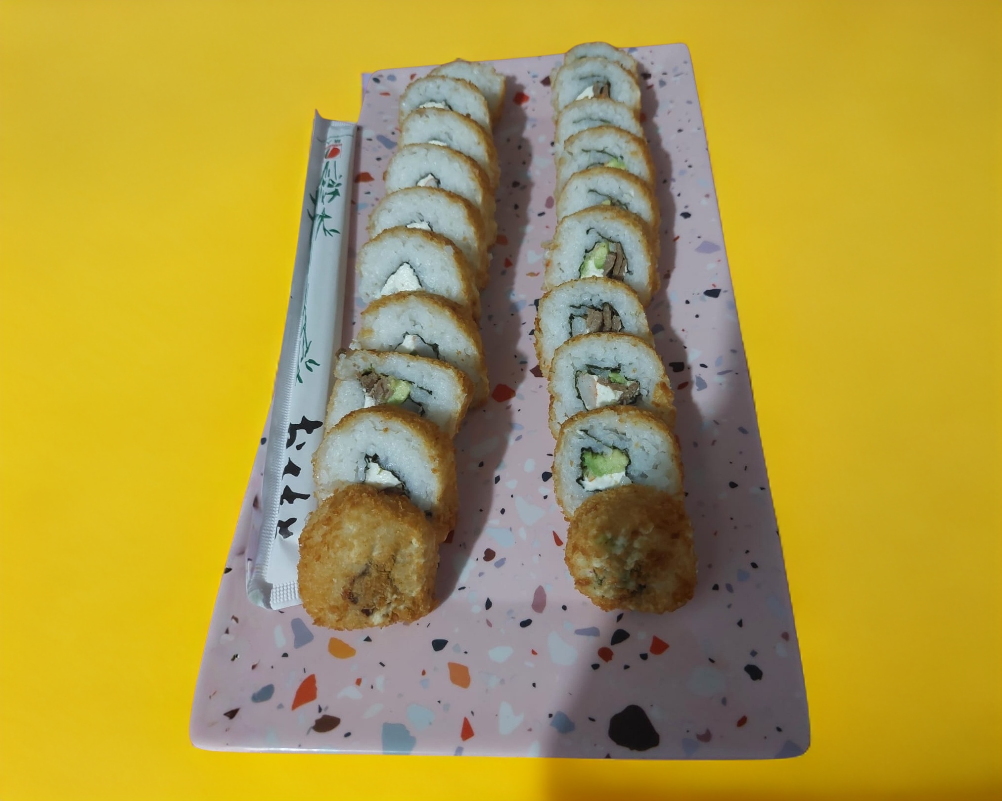 Un rollo con aguacate, tocino, pollo y philadelphia (10 bocados, porción personal).