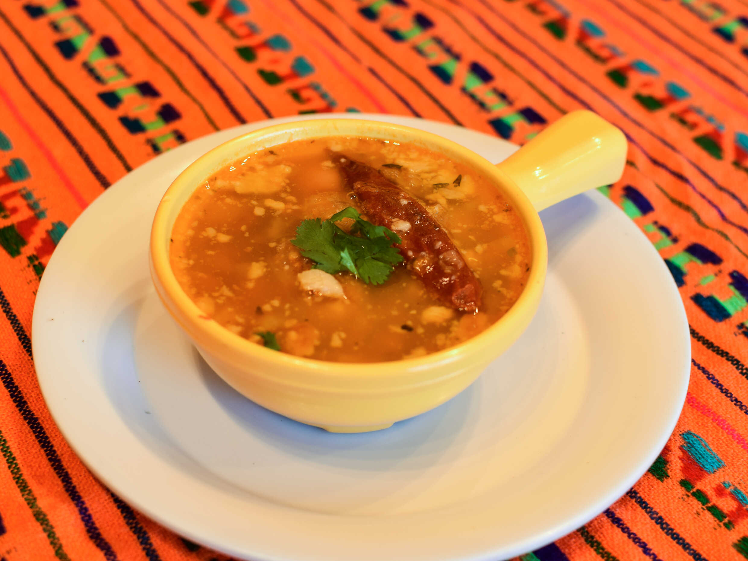 Caldo de res acompañado con arroz, tortillas y salsita molcajeteada. Acompañado de 2 enchiladas rojas rellenas de queso.