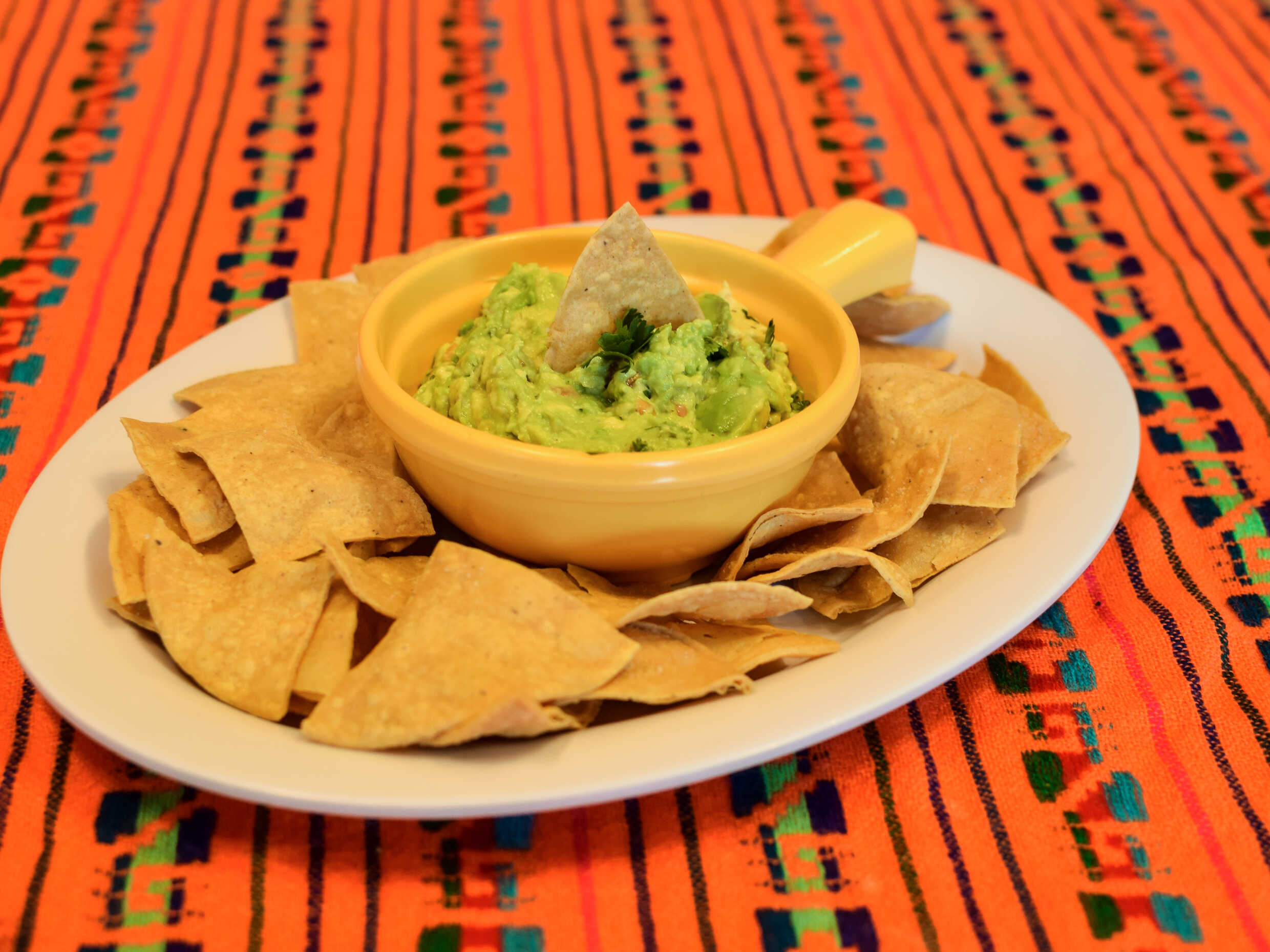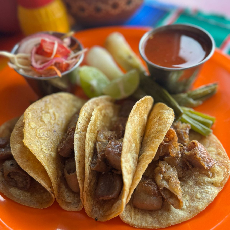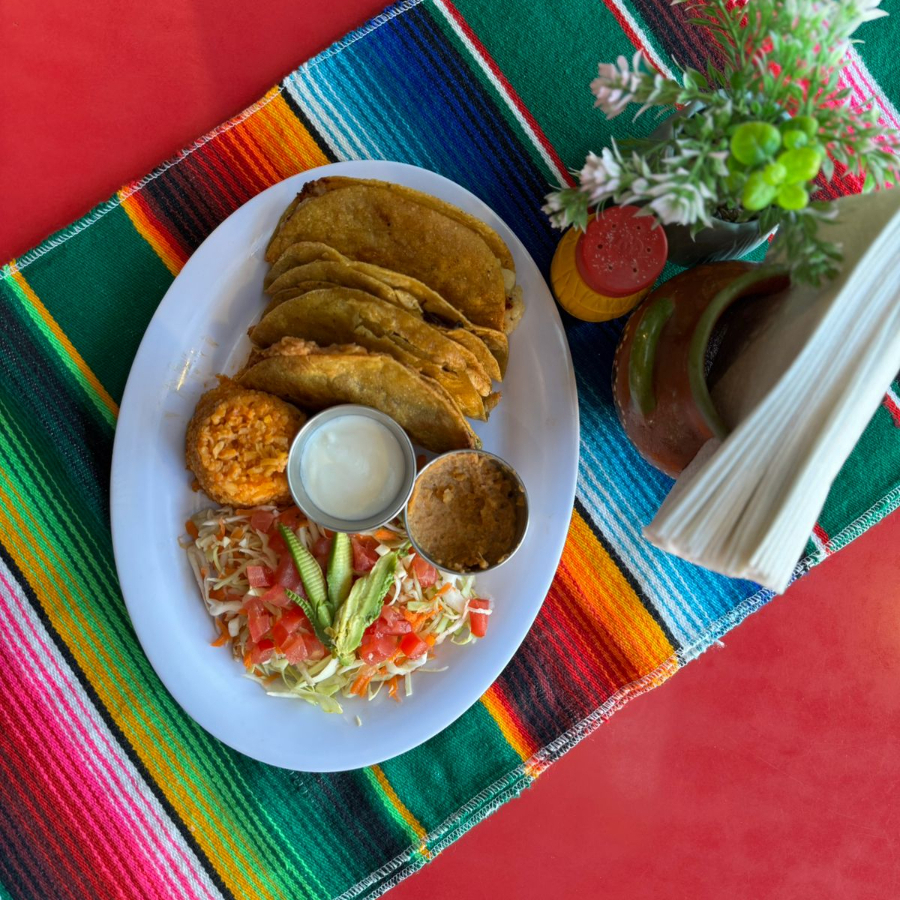 4 tacos de tortilla de maíz doraditos en manteca de puerco, ensalada, crema, aguacate, arroz y frijoles refritos.