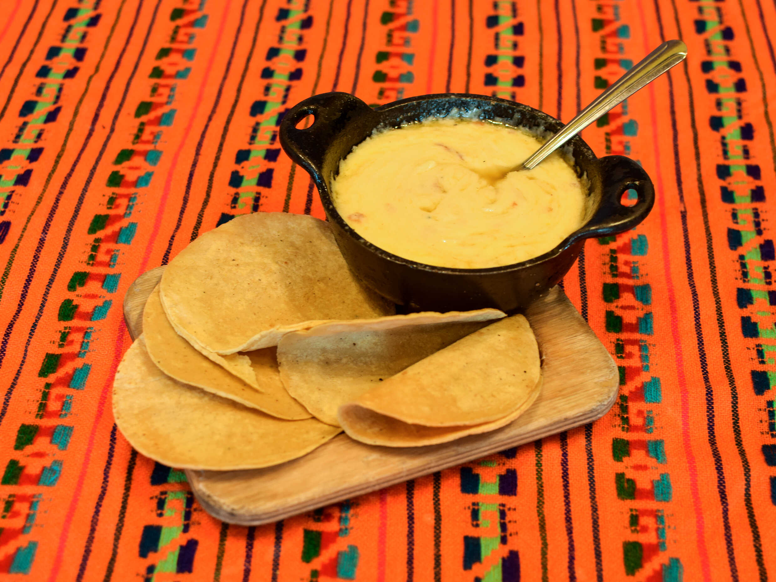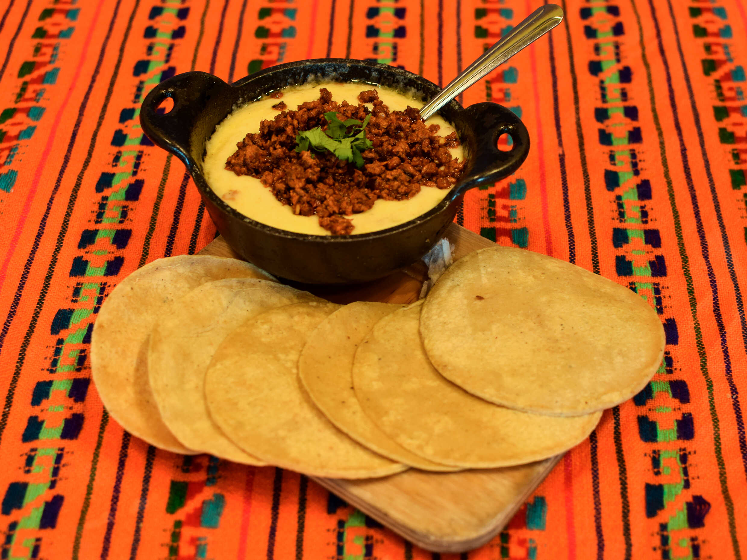 Queso fundido con chorizo acompañado con sus tortillas de maíz.