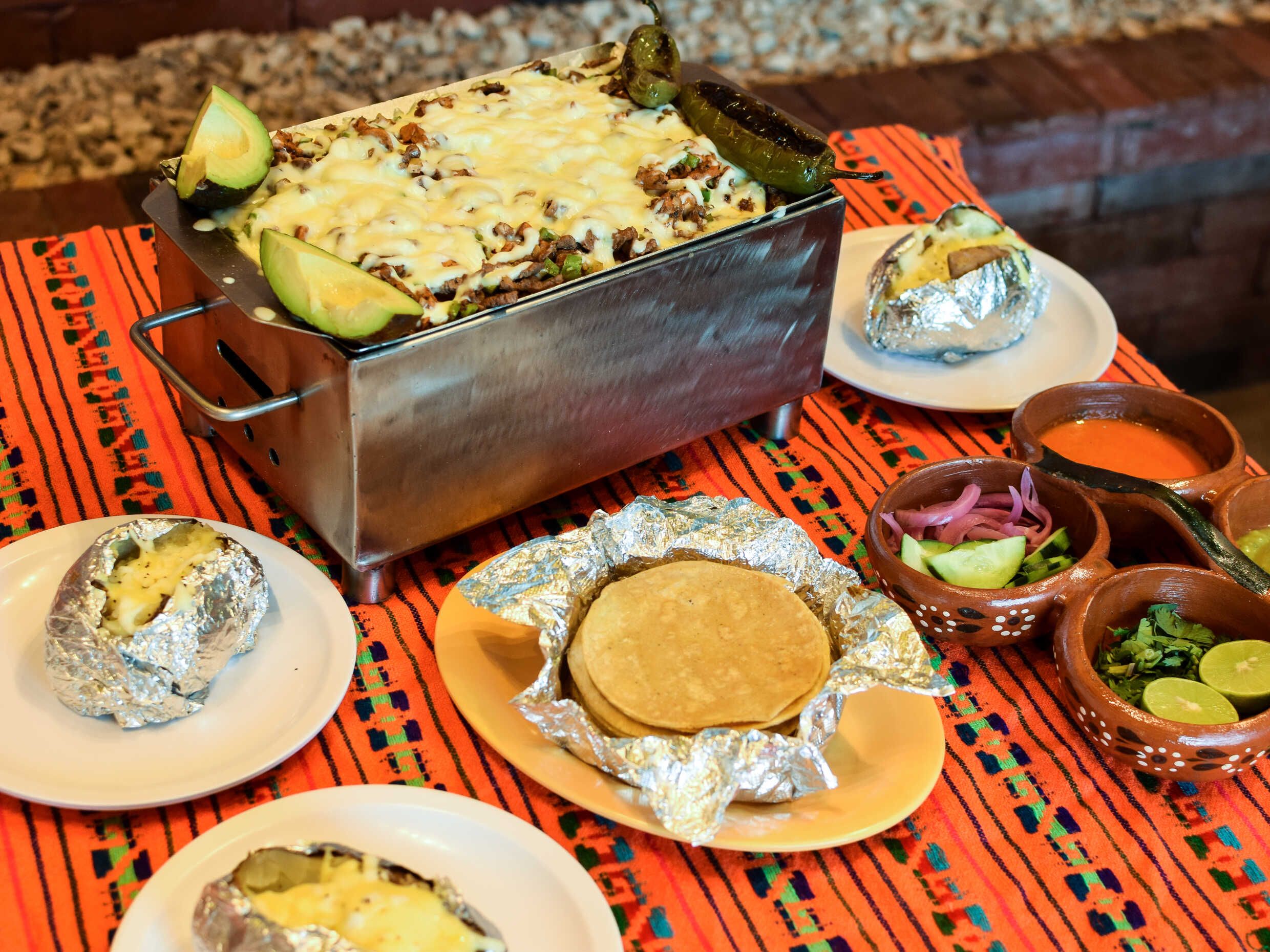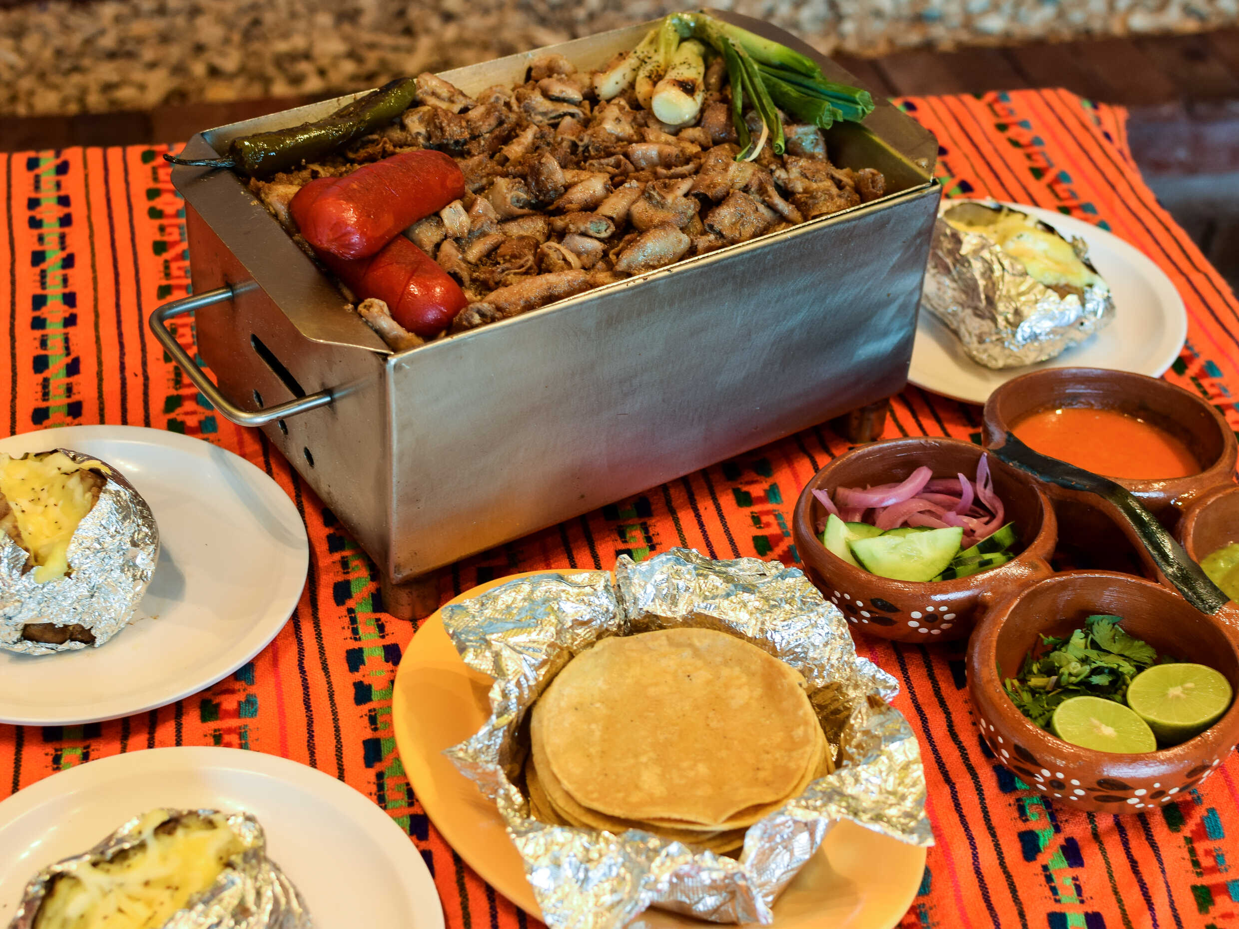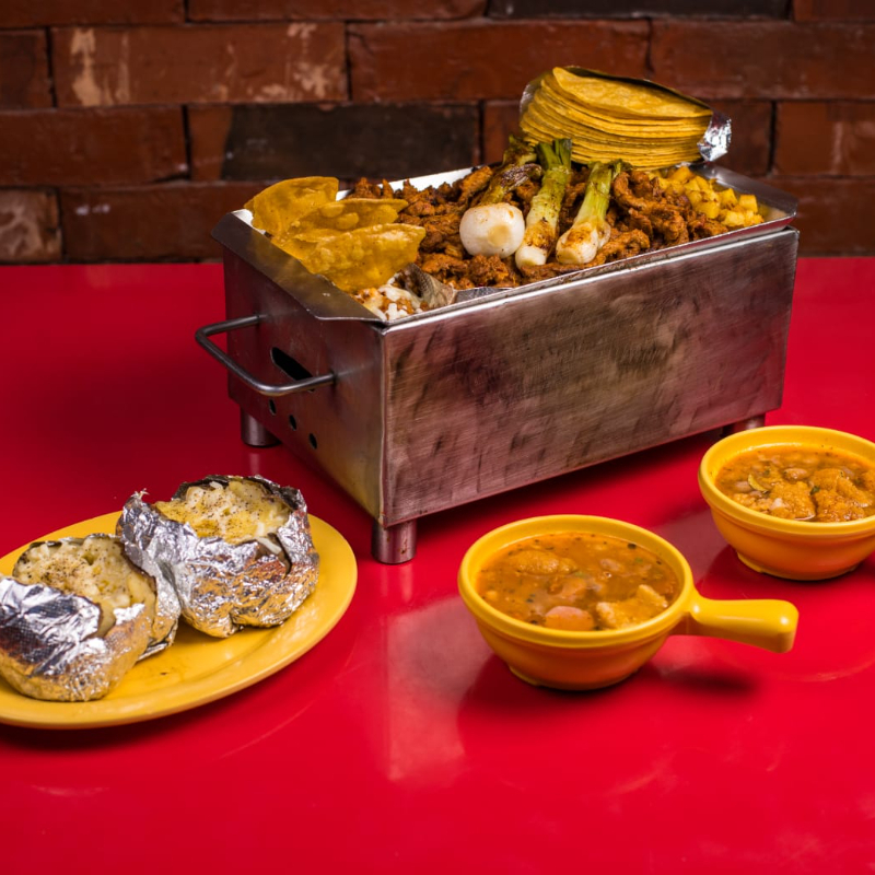 Todos los braseros para 2 personas incluyen 2 papas o 2 frijoles charros, tortillas, salsas y 425gr de la carne de su elección.