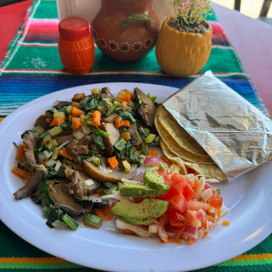 6 tacos de tortilla de maiz taquera, los tacos veganos están hechos a base de champiñones, calabaza y zanahoria.