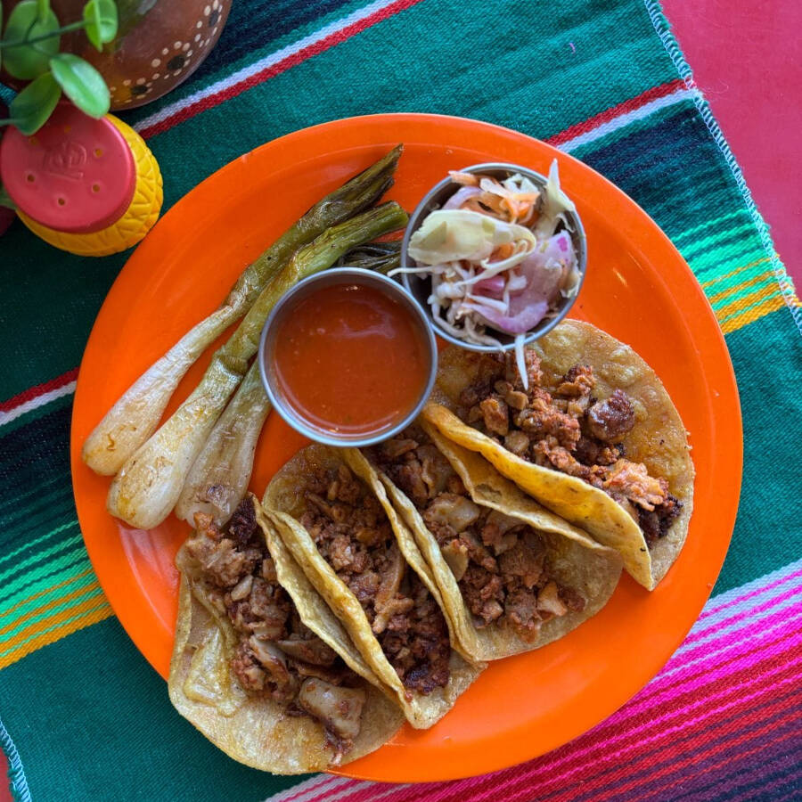 4 tacos de tortilla de maíz taquera con la carne de su elección acompañados de su ensalada de repollo (habanero, serrano y cebolla morada), guacamole y sus salsitas.