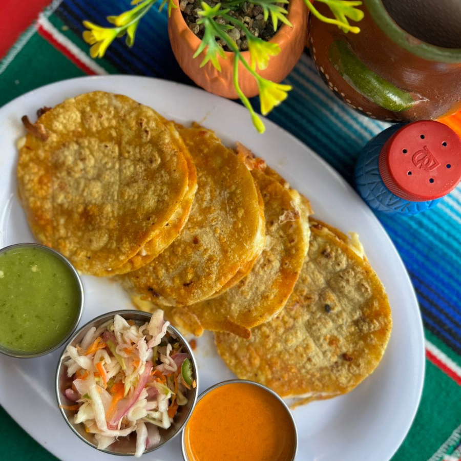 4 tortillas de mesa rellenas de queso bañados en la salsa de tu preferencia, arroz, frijoles refritos y ensalada.