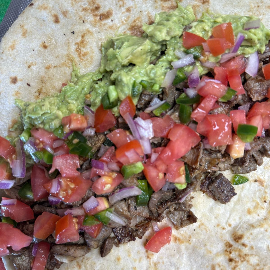 Tortilla de harina con bistec, guacamole y pico de gallo.