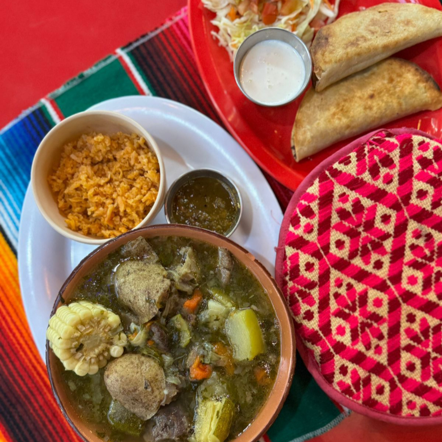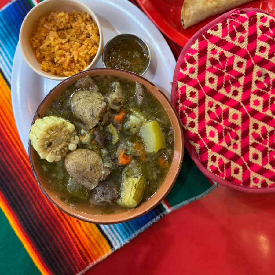 Caldo de res acompañado con arroz, tortillas y salsita molcajeteada. Acompañado de 2 enchiladas verdes rellenas de queso.