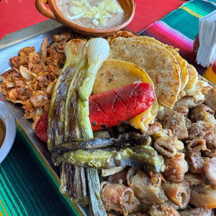 Incluye papa asada, aguacate en abanico, 1/2 salchicha asada, 1 chile toreado, tortillas y frijolitos charros