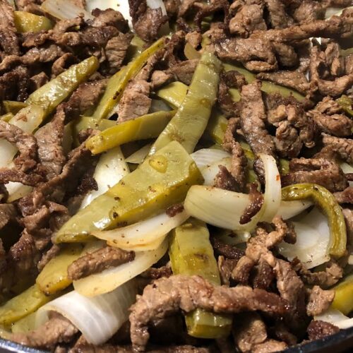 Bistec, morrón, cebolla, tocino y 12 tortillas de maíz.