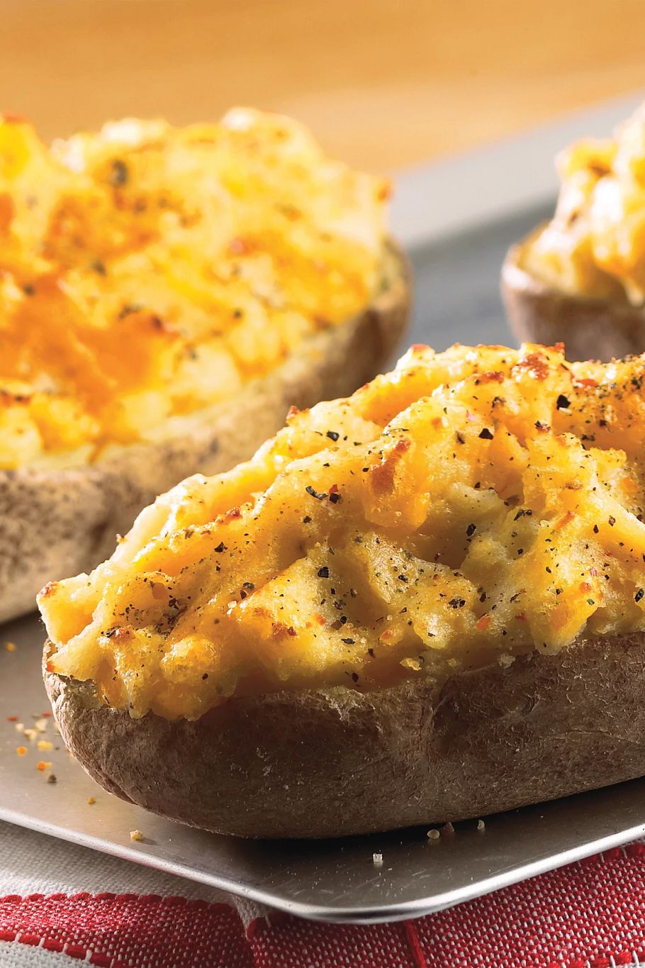 Papa preparada, pastor, queso, crema, tiras de pan c/ mantequilla.