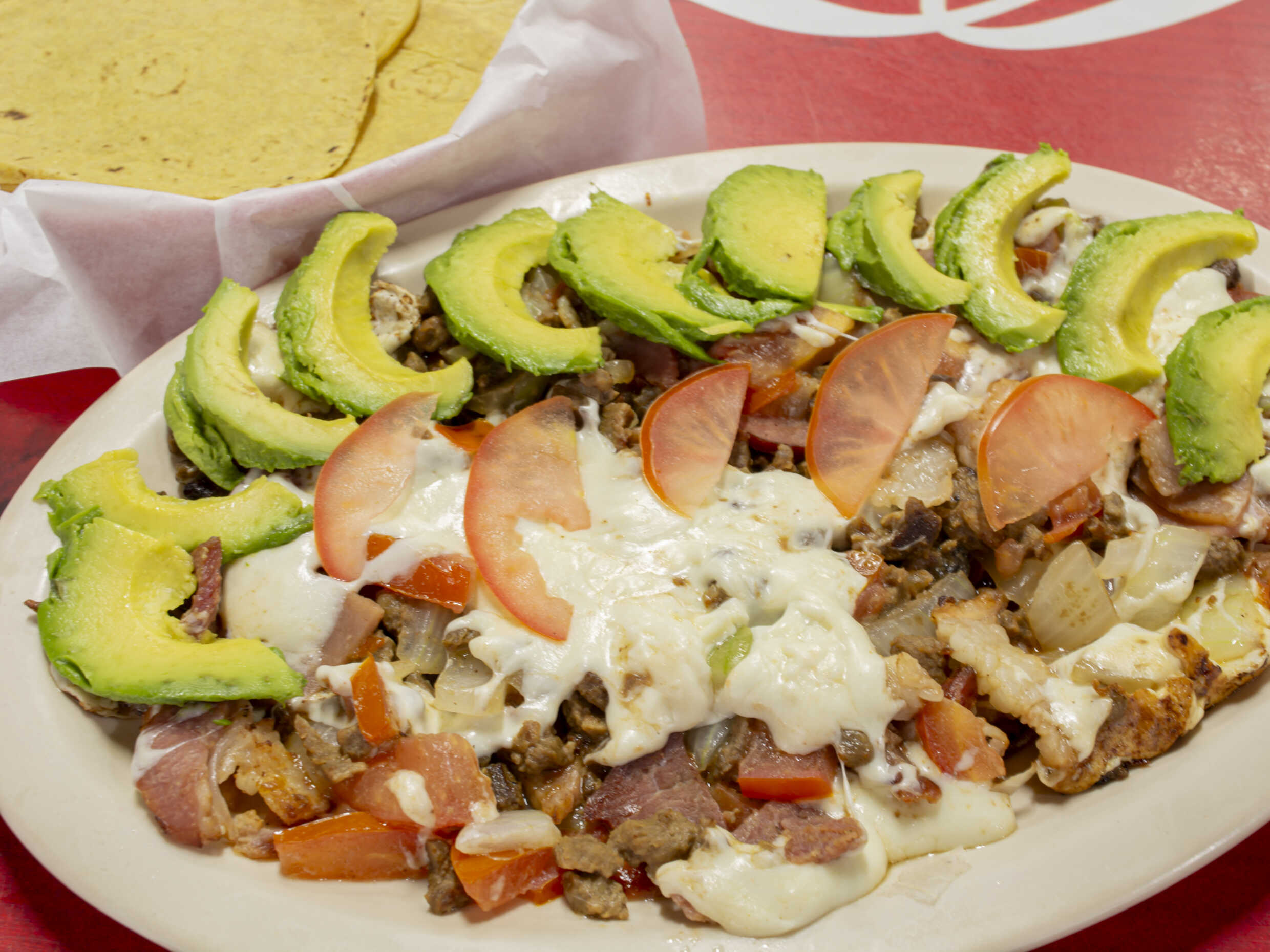 Bistec, tomate, cebolla, aguacate, jamón, tocino, queso gratinado.