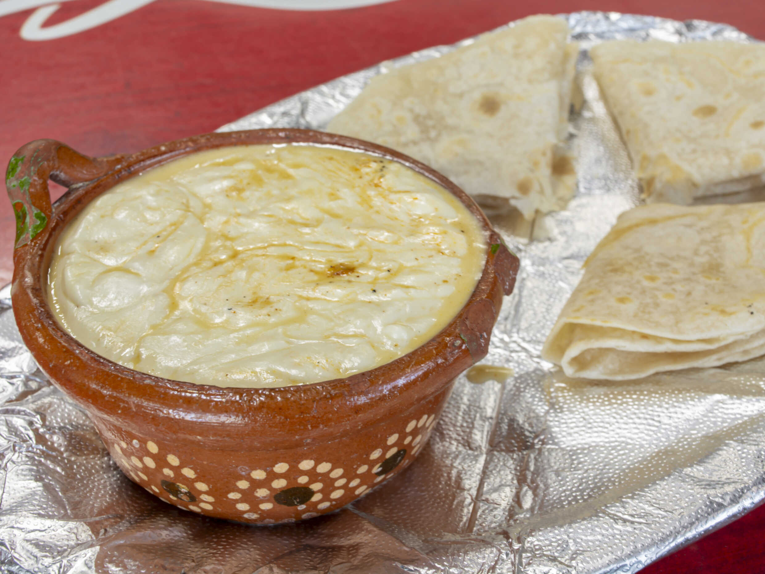 Queso gratinado, chorizo, 3 tortillas de harina.