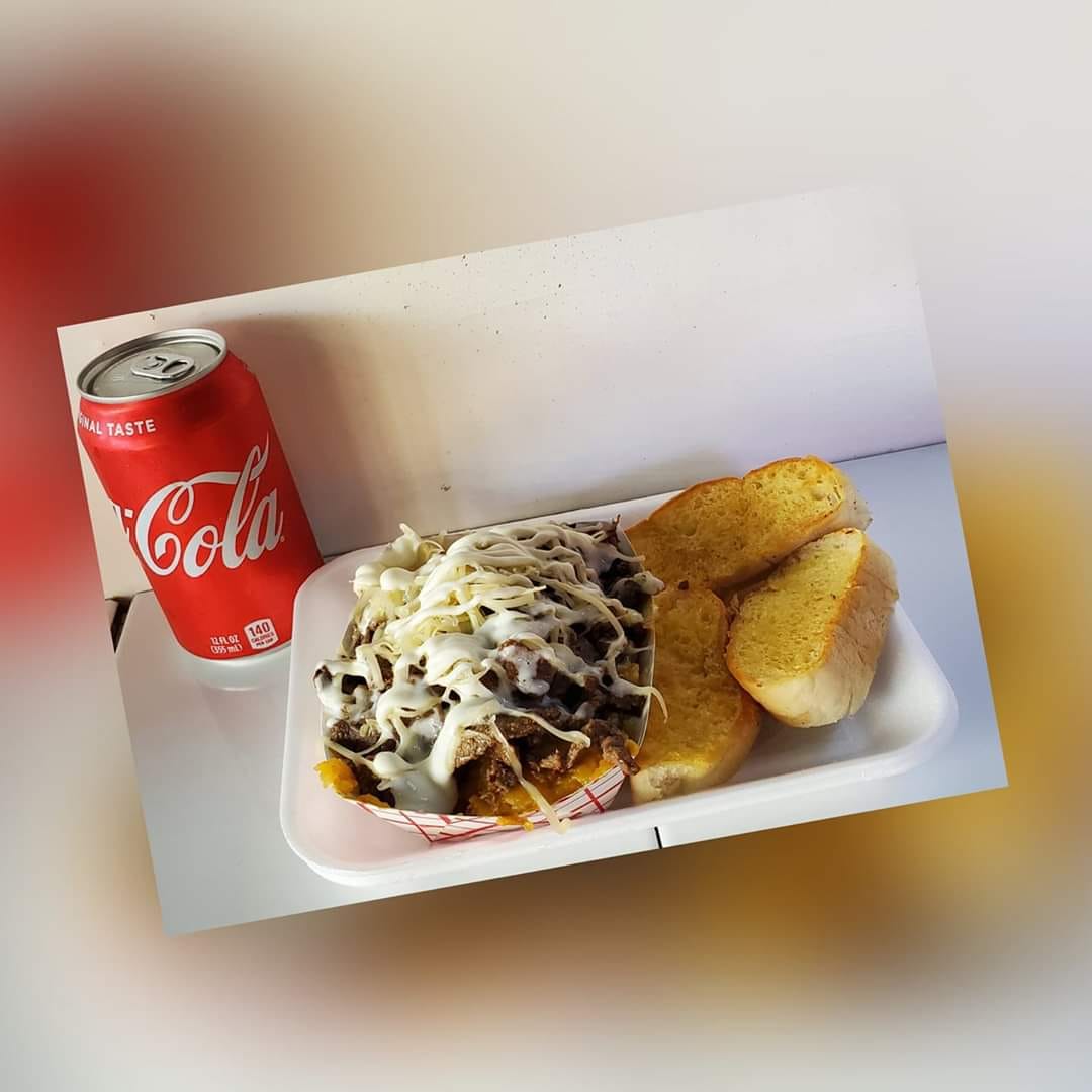 Papa preparada, bistec, queso, crema, tiras de pan c/ mantequilla.