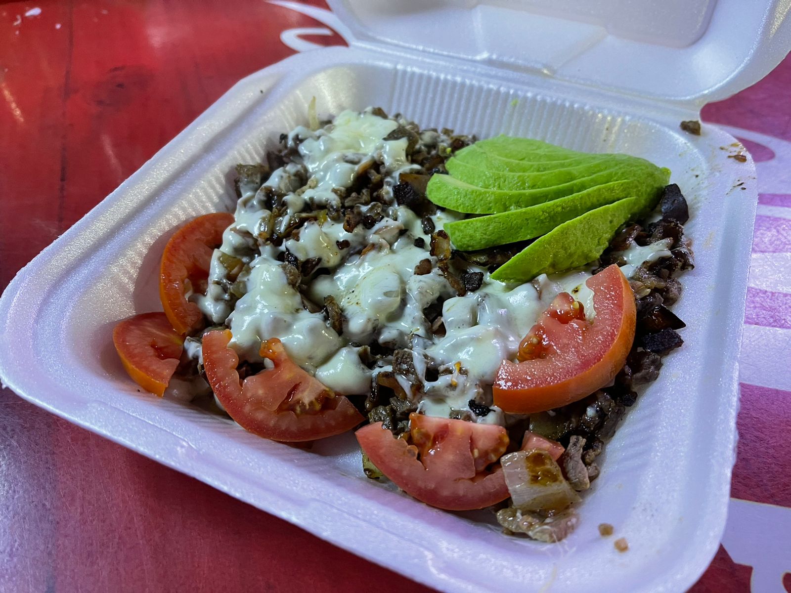 tostadas, queso de nachos, carne a elegir pastor o bistec, pico de gallo, queso y crema