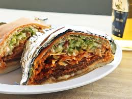 Bistec, chorizo, queso, lechuga, tomate, mayonesa, mostaza, aguacate y queso gratinado.