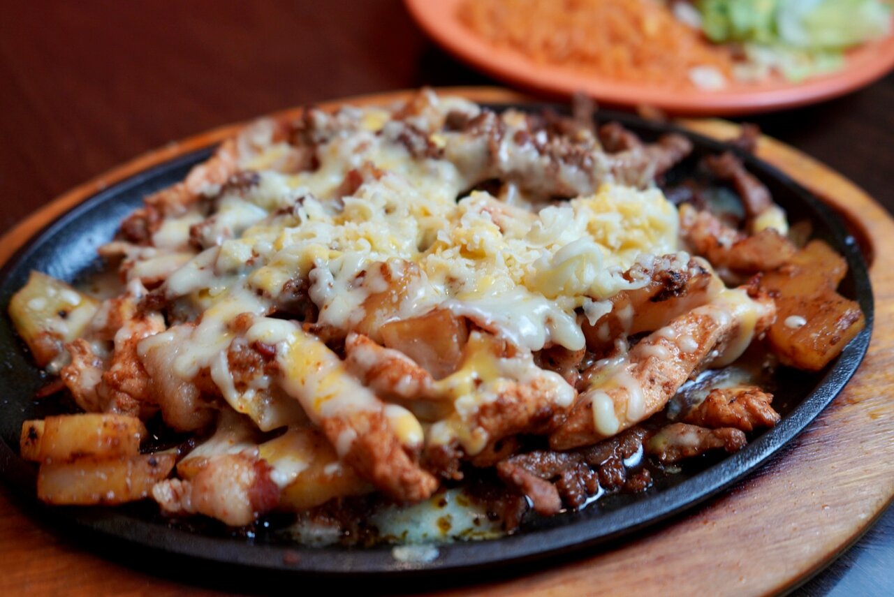 Bistec, cebolla, nopal, chorizo, tocino, queso gratinado.