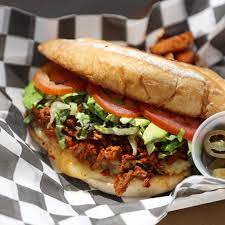 Jamón, queso, lechuga, tomate, mayonesa, mostaza, aguacate y queso gratinado.