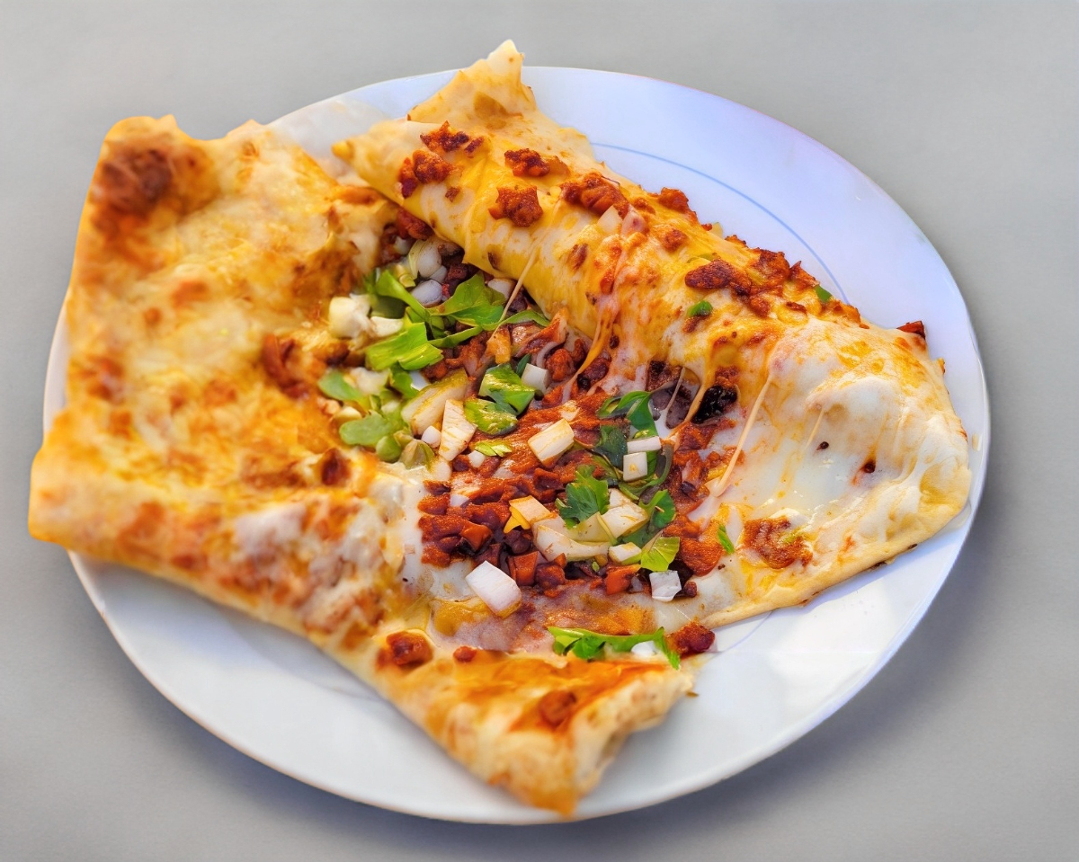 Chorizo dorado, acompañado de queso en una base de tortilla de harina. Ideal para quienes disfrutan sabores fuertes.