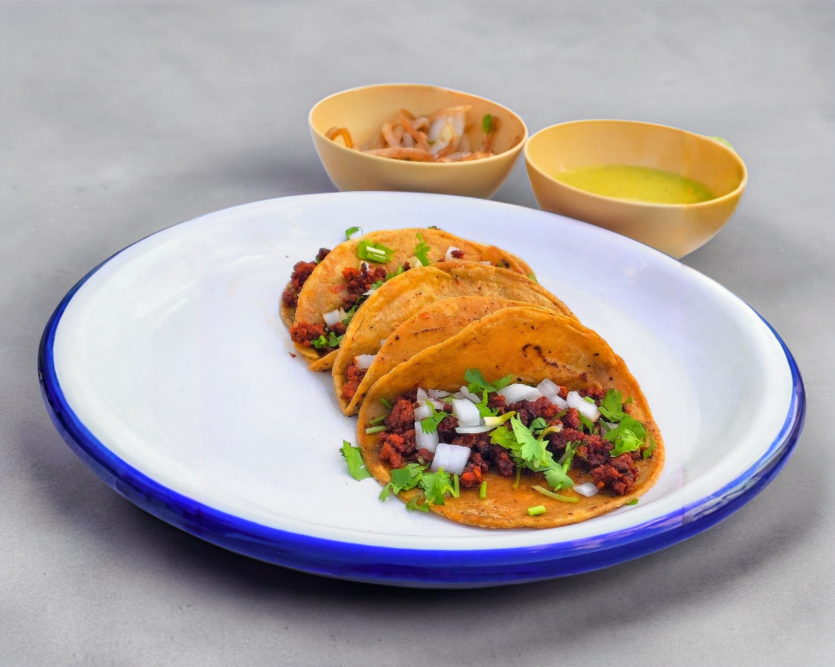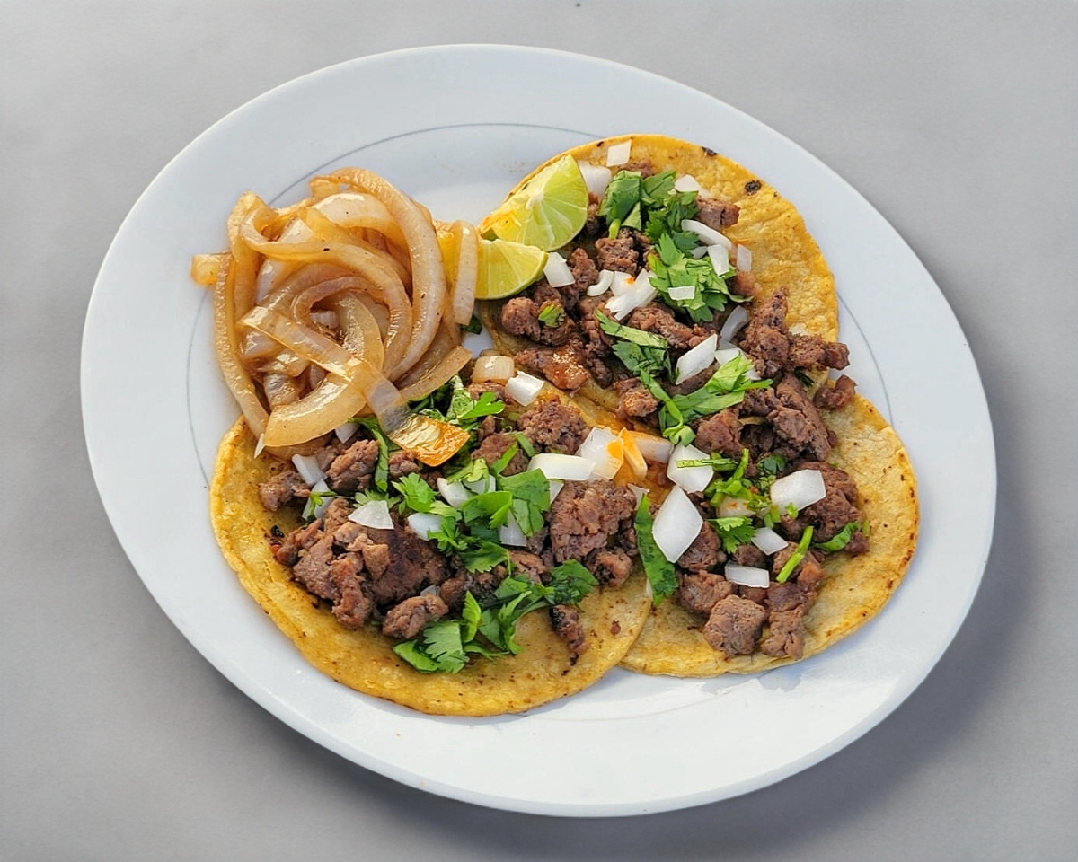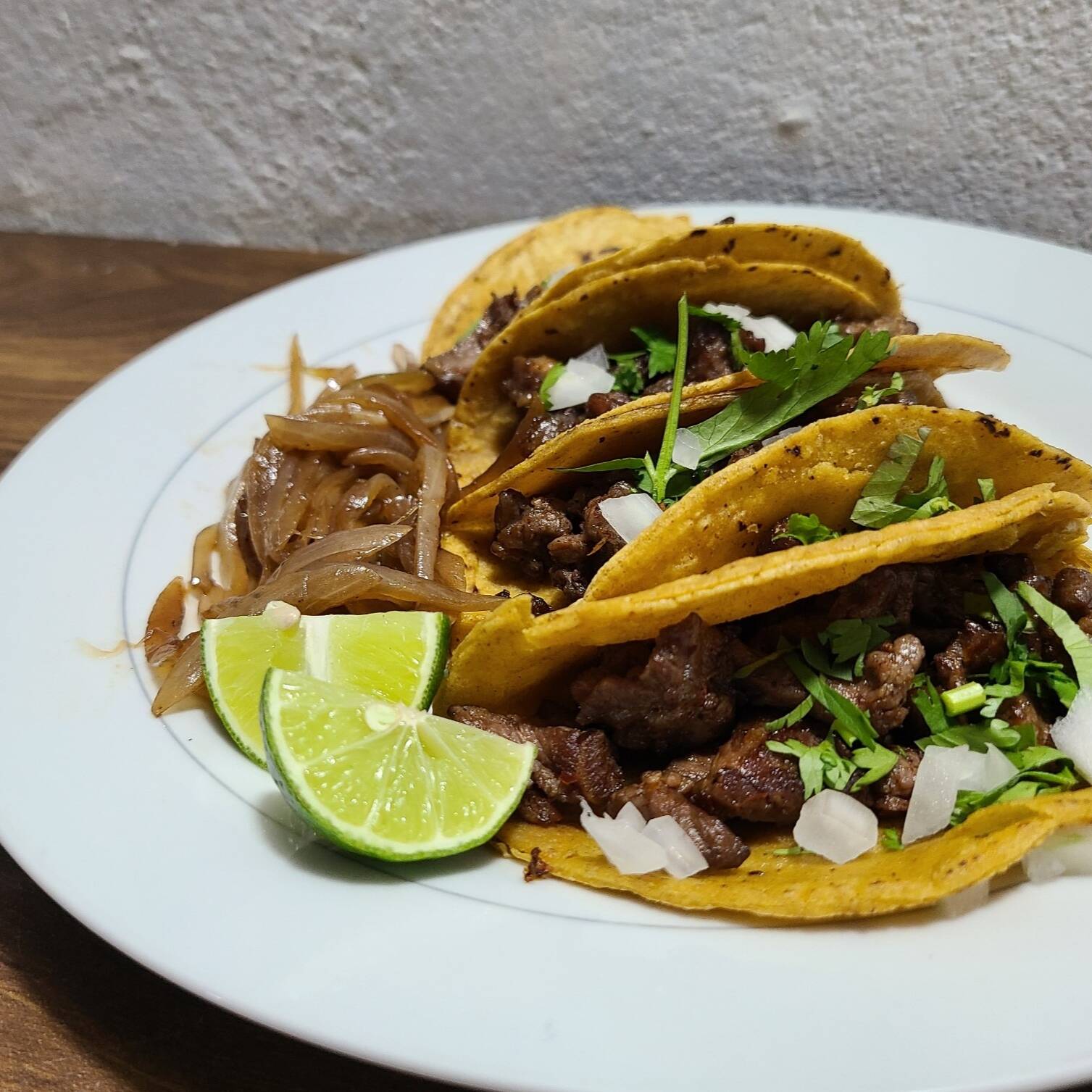 Bistec jugoso y bien sazonado, servido en tortillas de maíz con cebolla y cilantro fresco. Orden de 4.
