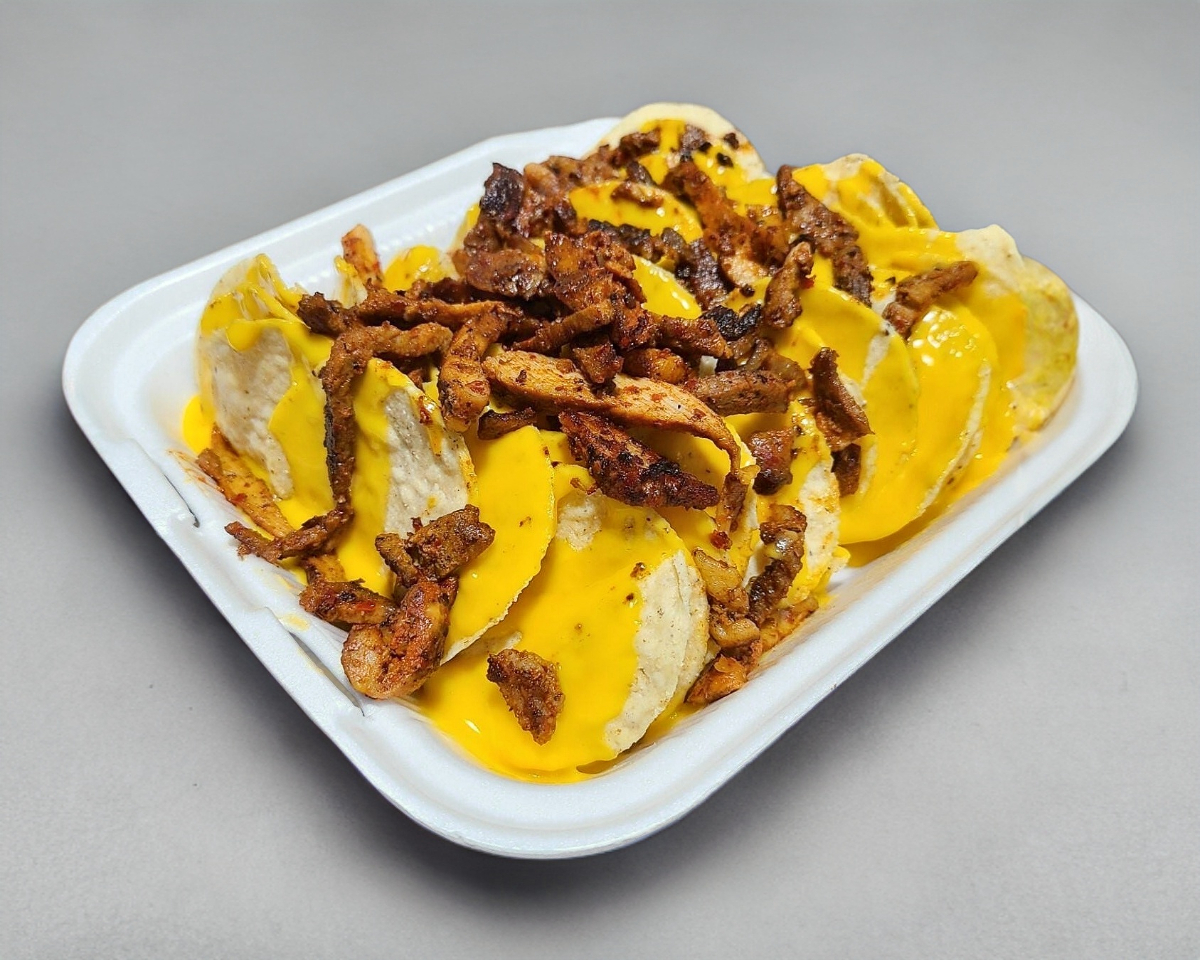 Totopos crujientes con una generosa porción de queso derretido y nuestro delicioso pastor al trompo. ¡Perfectos para compartir!