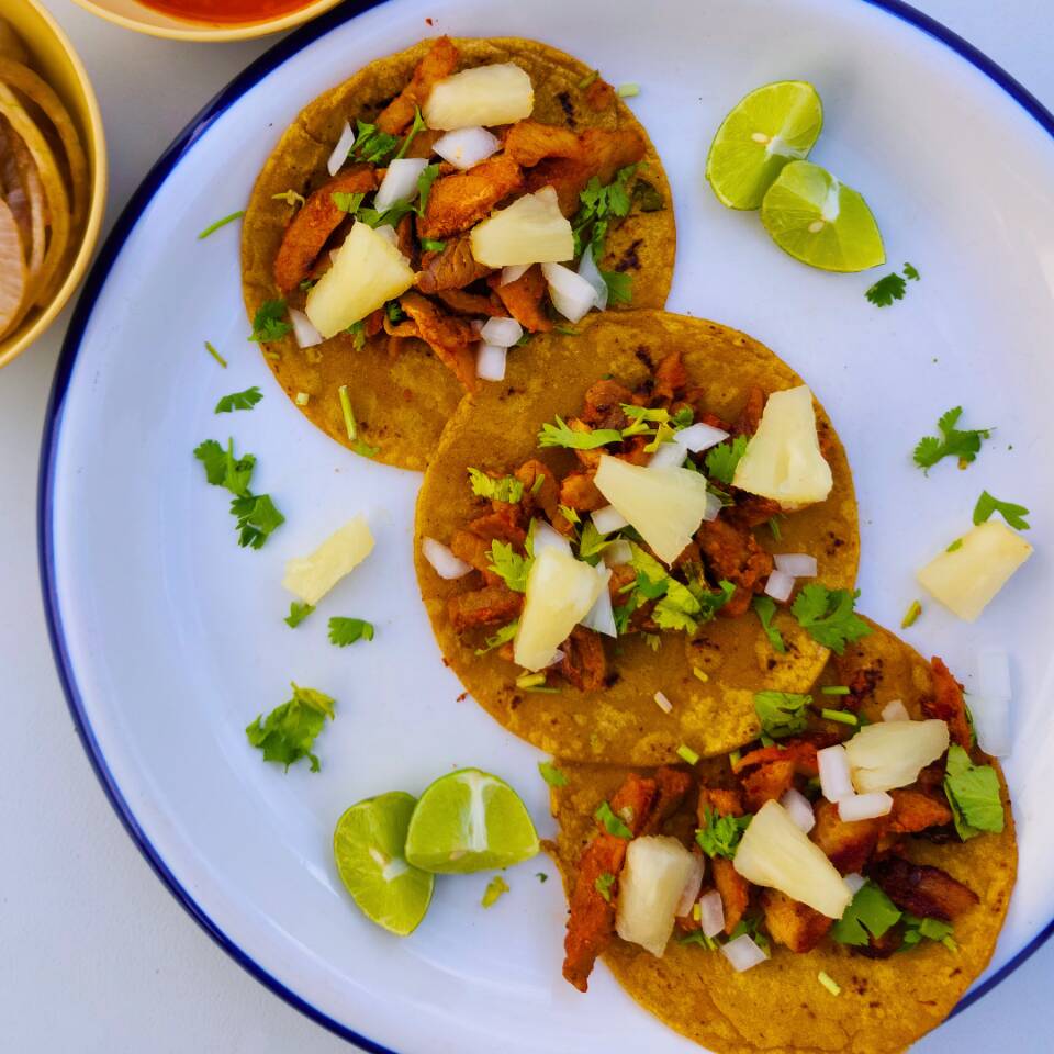 Deliciosos tacos al pastor, con carne marinada y asada lentamente al trompo. Servidos en tortillas suaves y acompañados de piña, cebolla, cilantro y salsa picante al gusto. Orden de 4.