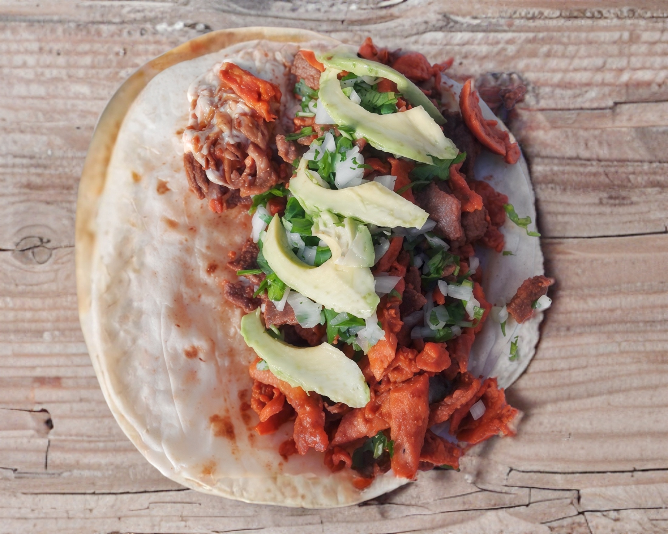Tortilla de Ariana grande carne pastor quesillo cebolla y cilantro