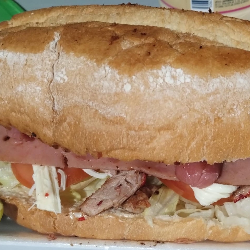 Más de medio kilo pan lagunero grande colita de pavo tomate cebolla lechuga aguacate jamón Winnie quesillo mayonesa (salsa roja verde aparte)