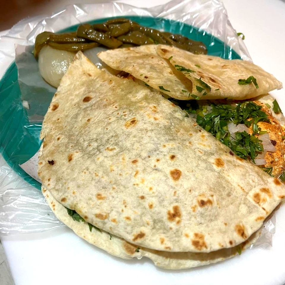 2 tortilla de harina con queso fundido,carne, piña cebollitas y nopales con su respectiva salsa y limones