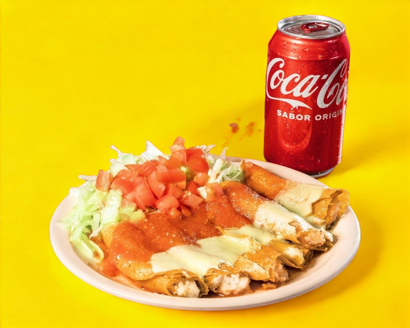 Combo de una orden de flautas de papa y un refresco de lata de 355 ml. A elegir: Coca-cola, Manzana o Sprite