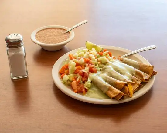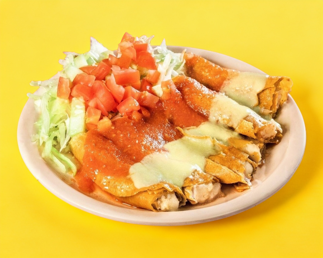 Orden de 3 flautas de doble tortilla, partidas a la mitad, acompañadas con 200 gr de ensalada a base de lechuga, tomate, pepino y zanahoria. Incluye una porcion de 2 oz de salsa de tomate, guacamole y salsa verde.