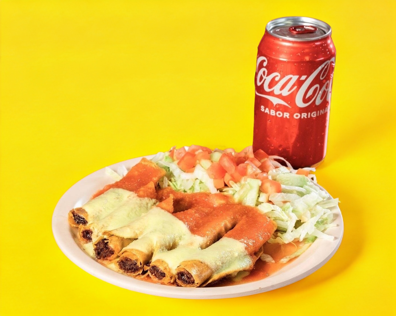 Combo de una orden de flautas de carne y un refresco de lata de 355 ml. A elegir: Coca-cola, Manzana o Sprite