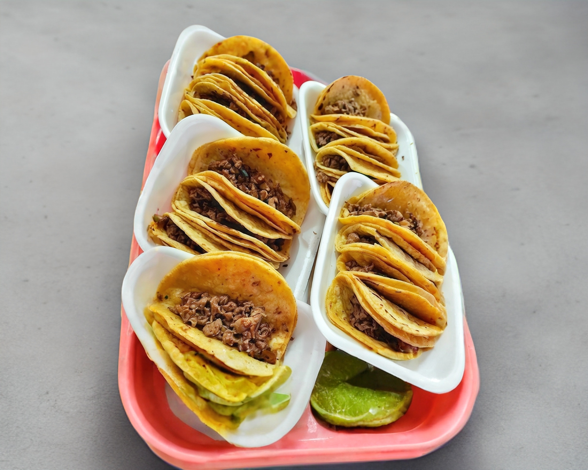 5 tacos de asada,salsa roja ,guacamole ,pico de gallo y cebollitas
