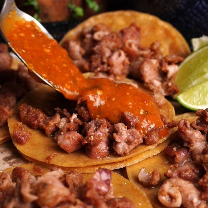 1 Kg de carne, 48 piezas de tortillas, salsas y verdura aparte