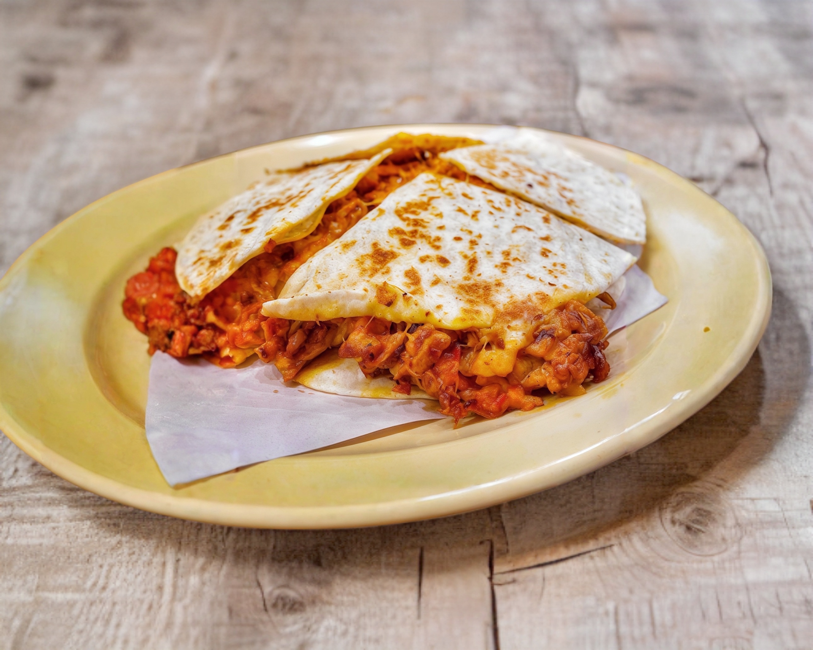 Quesadilla de 2 tortillas rellenas de bistec y queso.