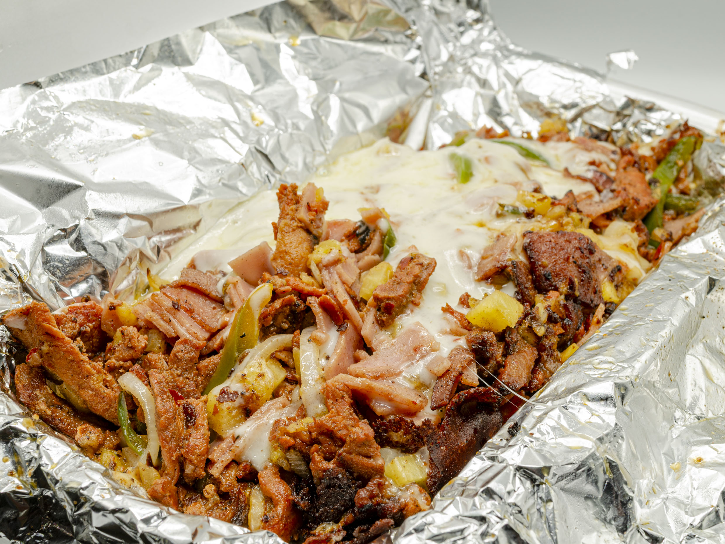 Carne sirloin, queso philadelfia, piña, salchicha, mostaza, cátsup, mayonesa, lechuga, pepinillos y cebolla.