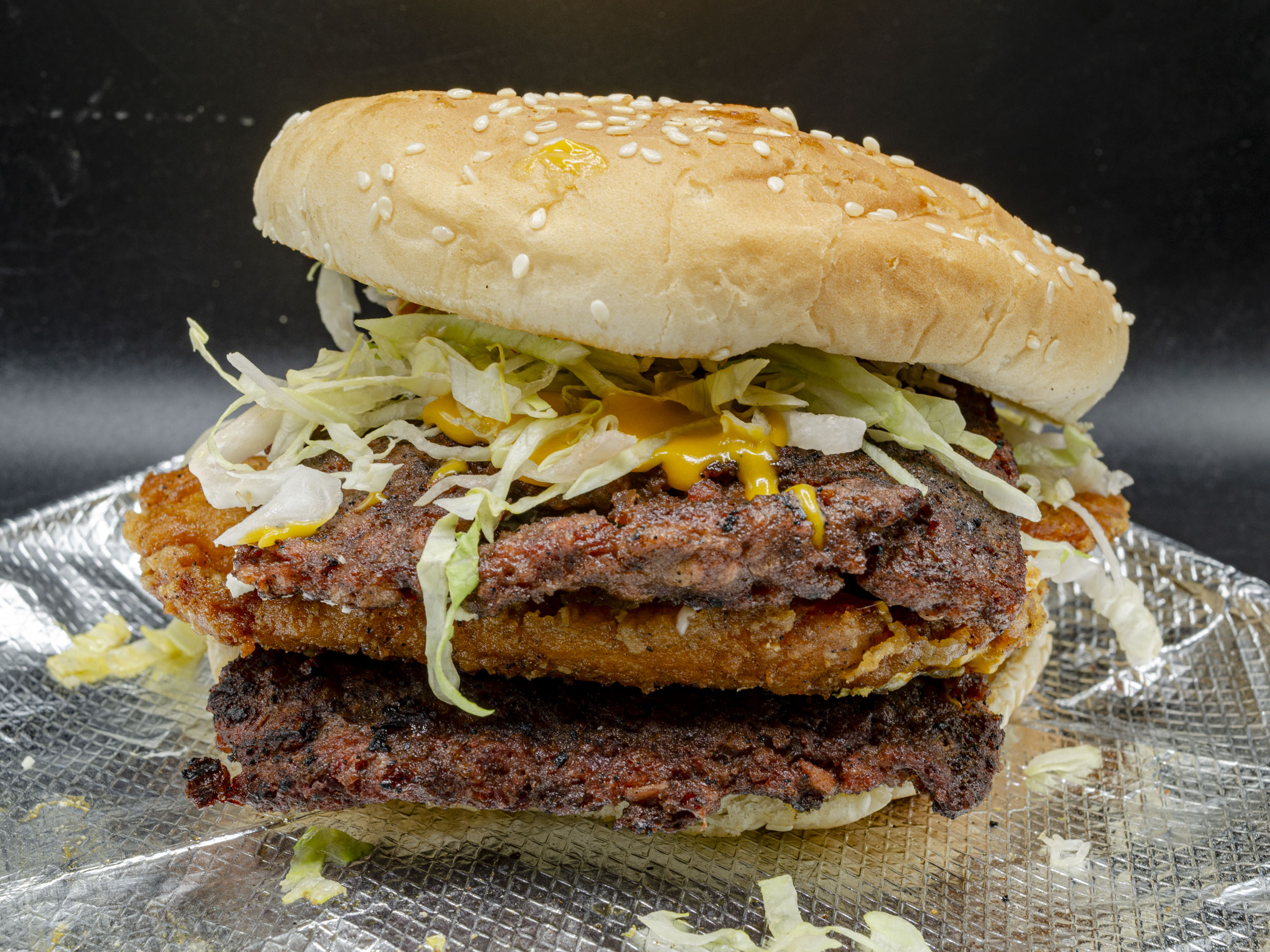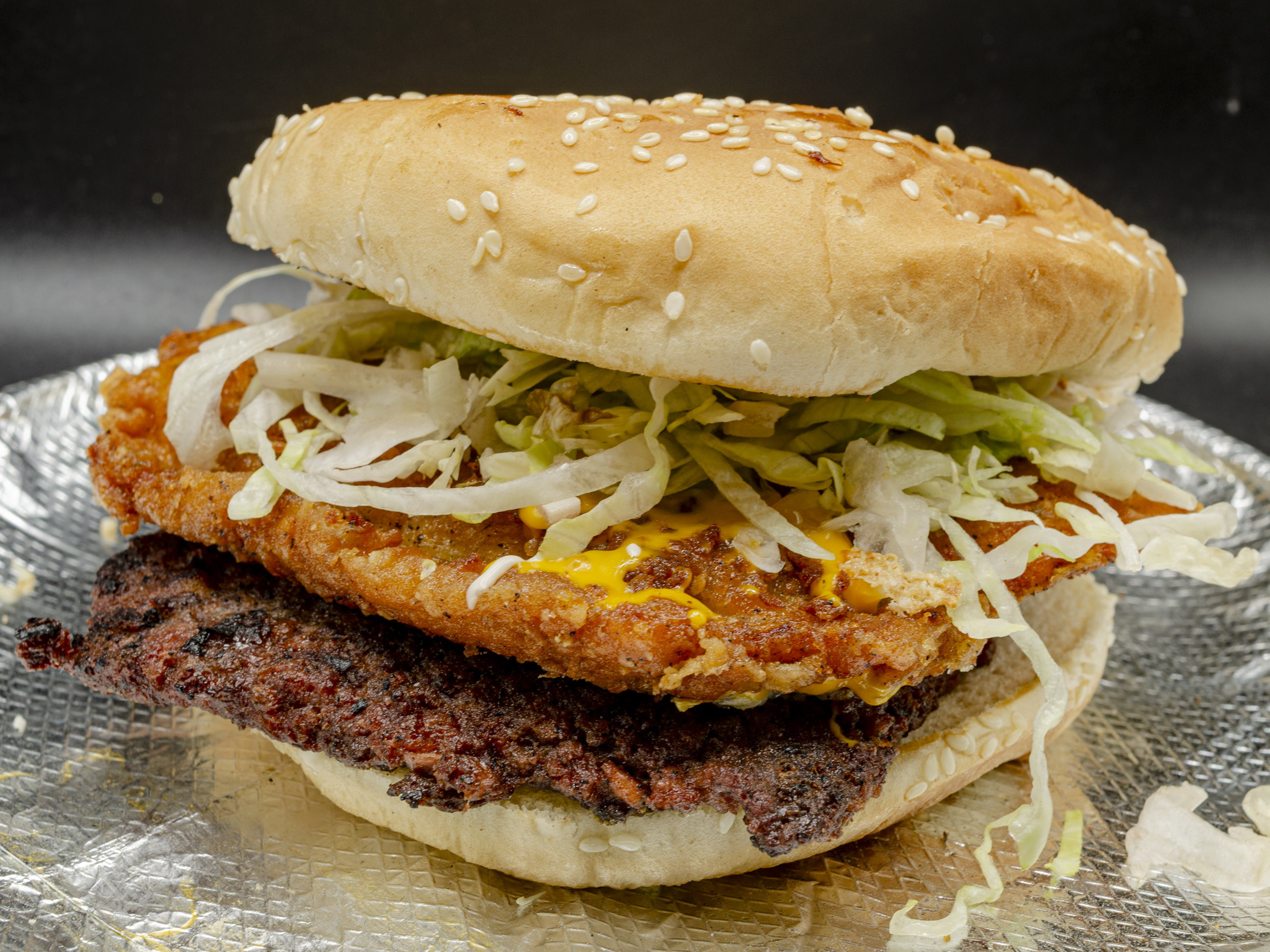 Hamburguesa al Carbón. Dos carnes sirloin (280gr), pechuga spicy, queso amarillo, mostaza, cátsup, mayonesa, lechuga, pepinillos y cebolla.