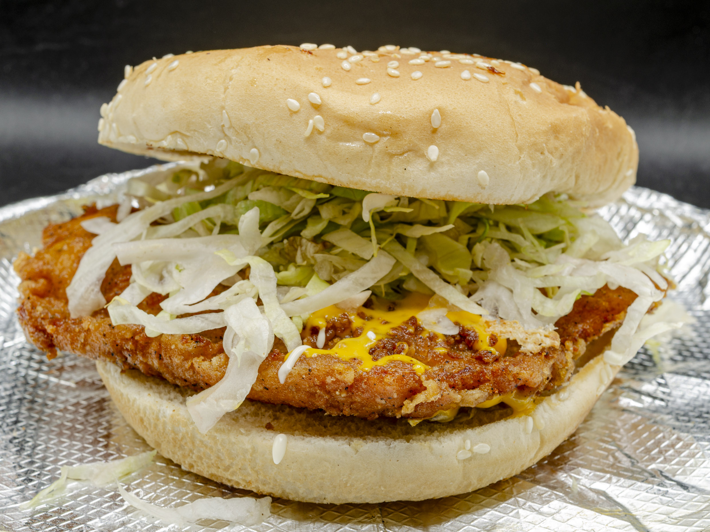 Hamburguesa al Carbón. Dos pechugas de pollo spicy, queso amarillo, piña, tocino, mango habanero, mayonesa, lechuga y cebolla.
