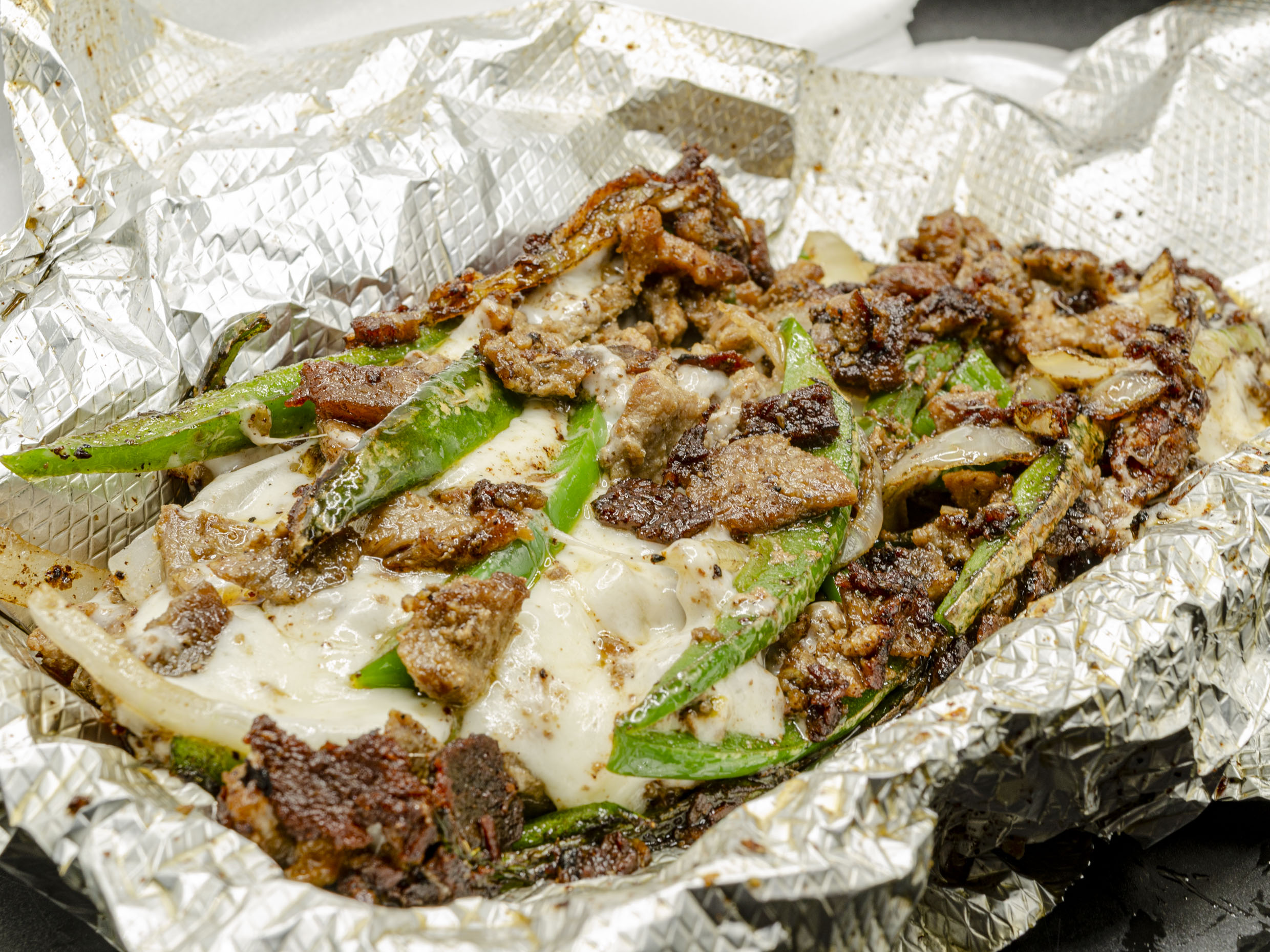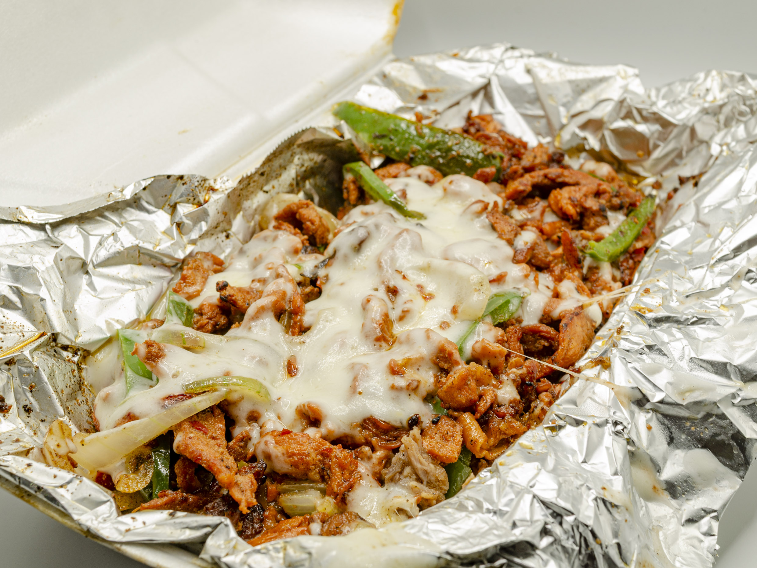 Bistec con con queso blanco gratinado, cebolla, chile morrón, 13 tortillas.
