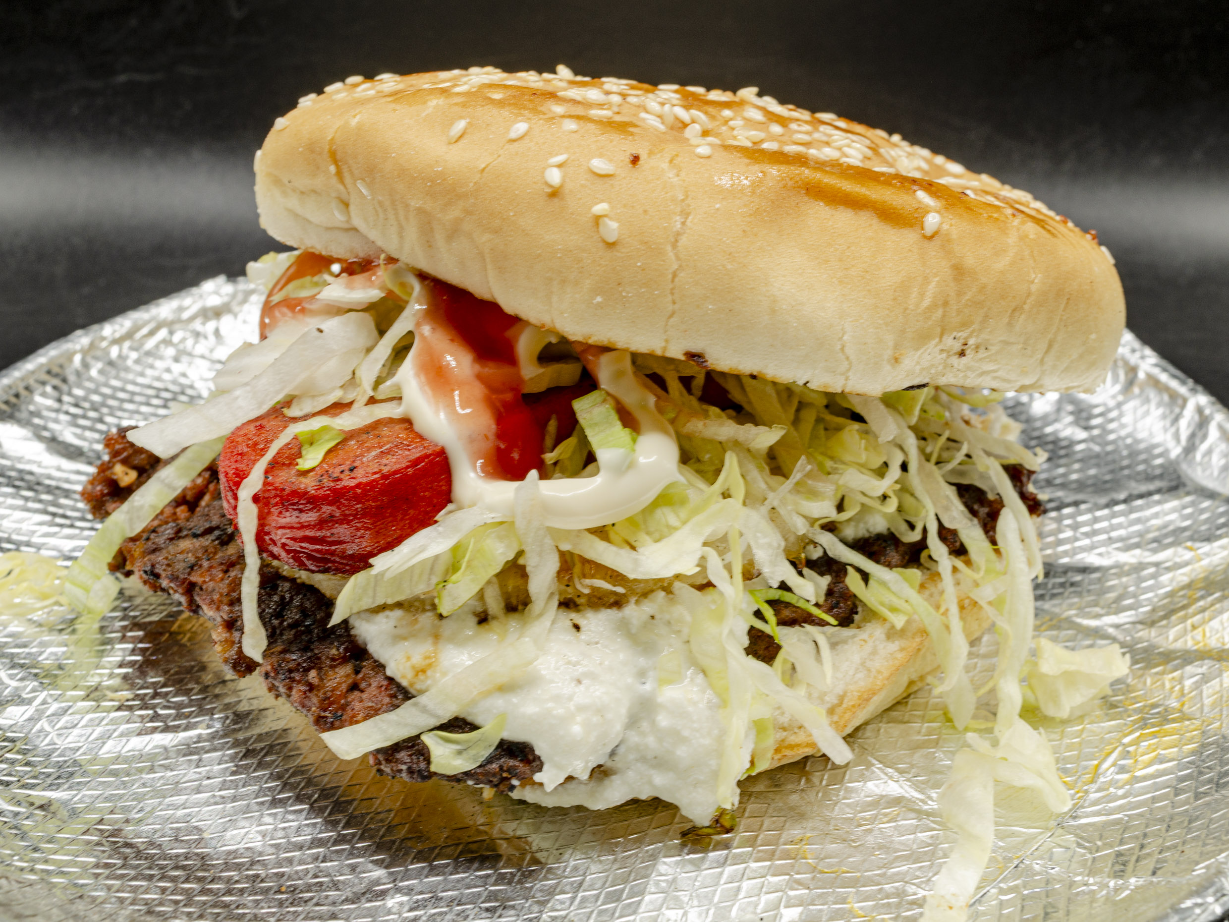 Hamburguesa al Carbón. Dos carnes sirloin, pastor, bistec, queso blanco, jamón, salchicha, tocino, lechuga y mayonesa.