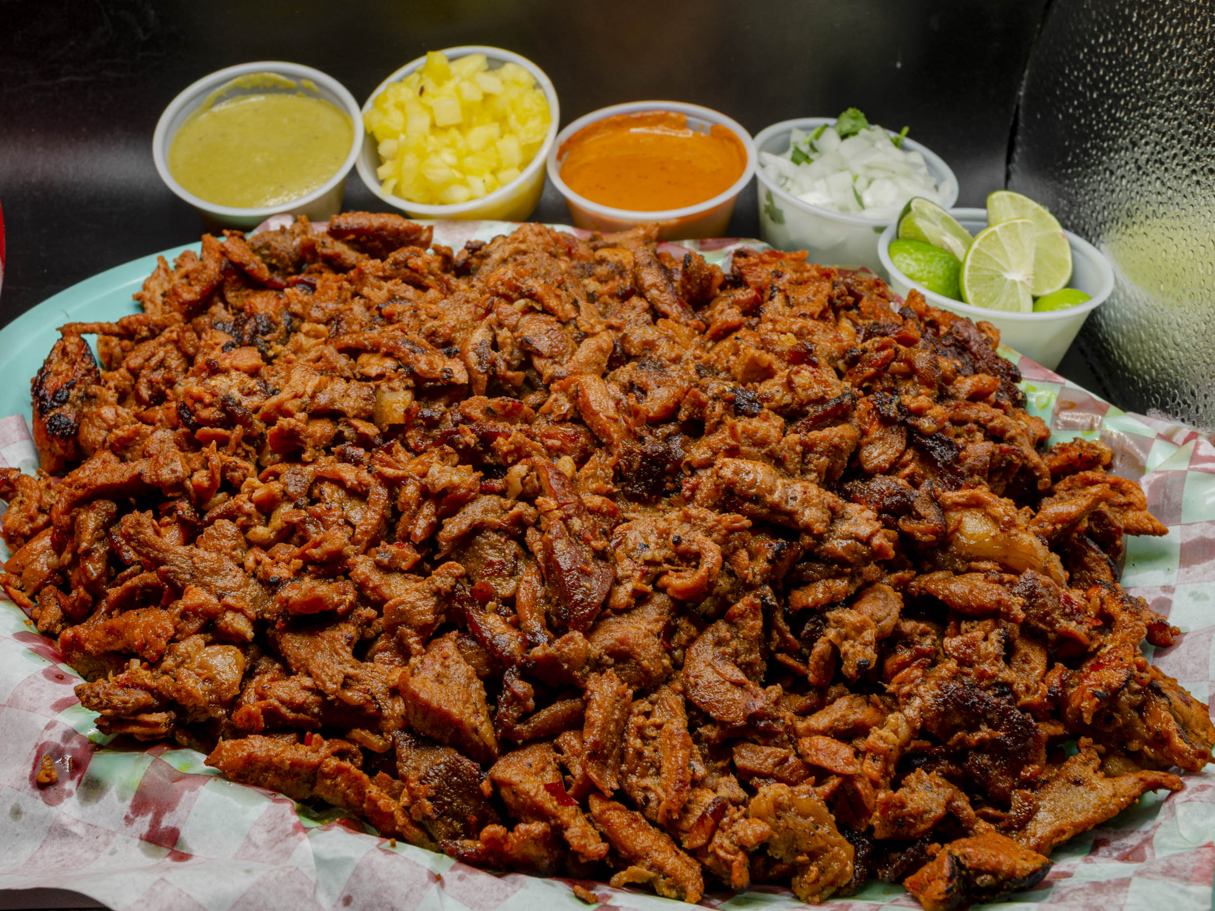 Acompañado de 40 tortillas, salsa verde, salsa de cacauate, cebolla, cilantro, pepino y rábanos, limones y refresco jarrrito de 2 litros.