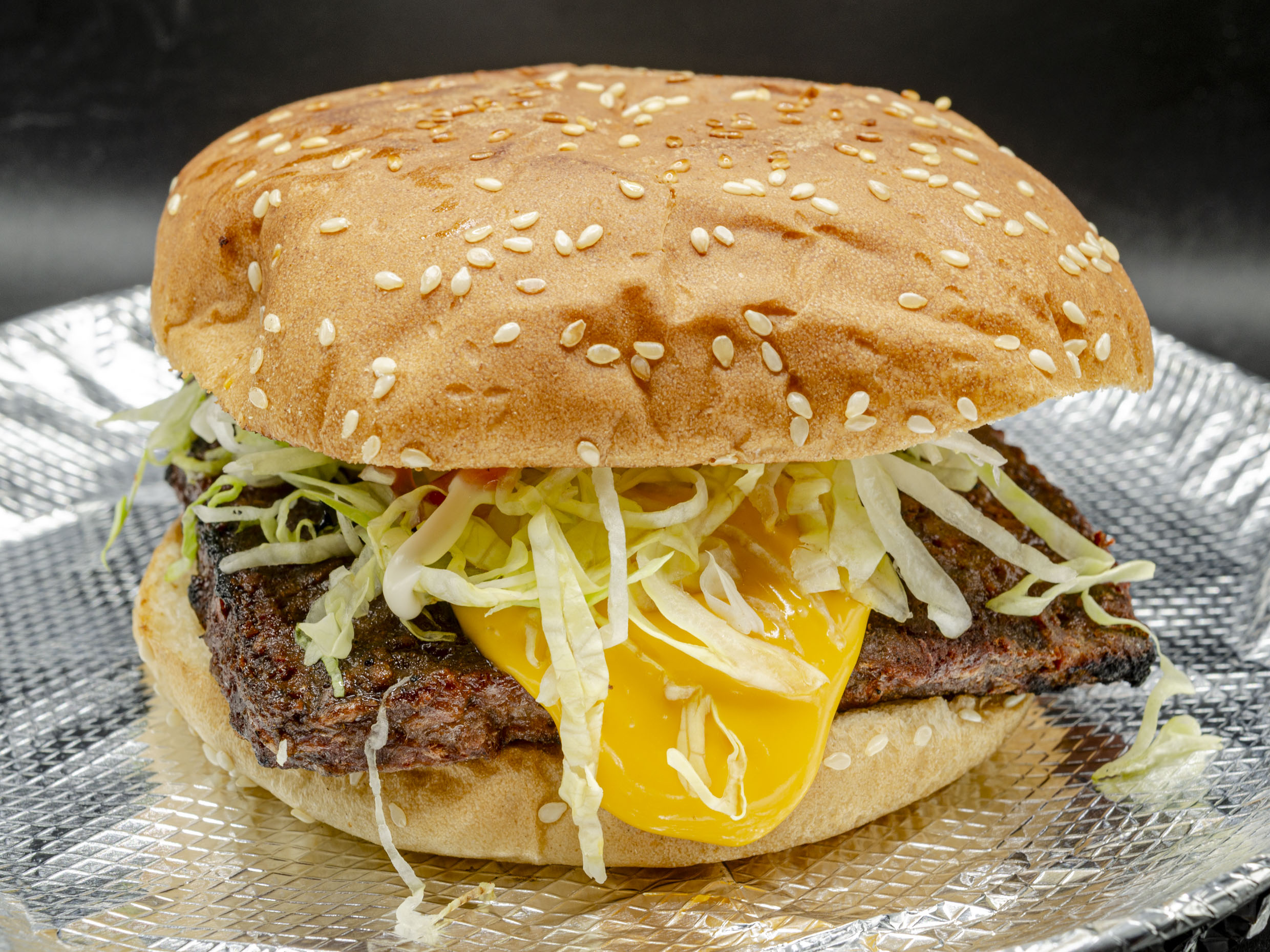 Hamburguesa al Carbón. Triple carne de sirloin, queso amarillo, mostaza, mayonesa, lechuga, pepinillos y cebolla.